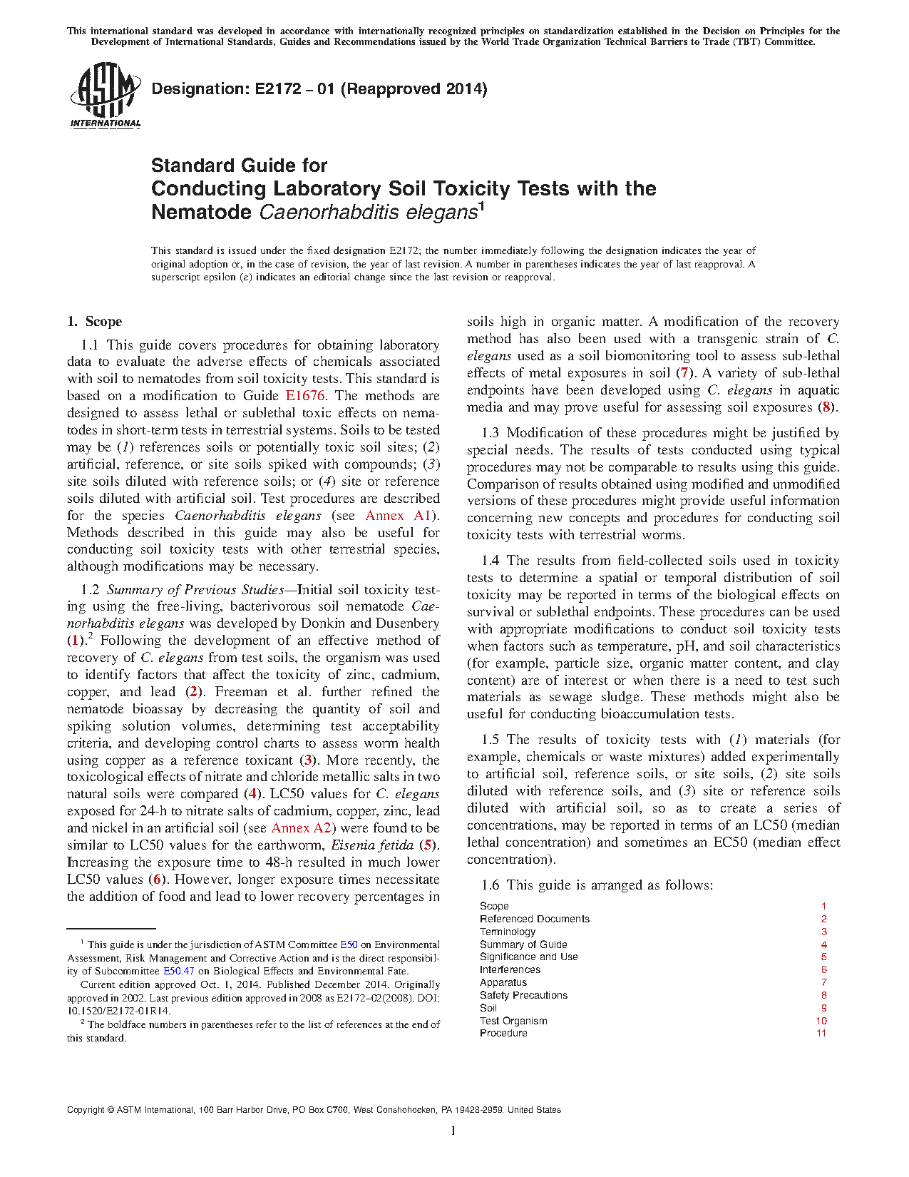 1.2 Summary of Previous Studies—Initial soil toxicity testing using the free-living, bacterivorous soil nematode Caenorhabditis elegans was developed by Donkin and Dusenbery (1). Following the development of an effective method of recovery of C. elegans from test soils, the organism was used to identify factors that affect the toxicity of zinc, cadmium, copper, and lead (2). Freeman et al. further refined the nematode bioassay by decreasing the quantity of soil and spiking solution volumes, determining test acceptability criteria, and developing control charts to assess worm health using copper as a reference toxicant (3). More recently, the toxicological effects of nitrate and chloride metallic salts in two natural soils were compared (4). LC50 values for C. elegans exposed for 24-h to nitrate salts of cadmium, copper, zinc, lead and nickel in an artificial soil (see Annex A2) were found to be similar to LC50 values for the earthworm, Eisenia fetida (5). Increasing the exposure time to 48-h resulted in much lower LC50 values (6). However, longer exposure times necessitate the addition of food and lead to lower recovery percentages in soils high in organic matter. A modification of the recovery method has also been used with a transgenic strain of C. elegans used as a soil biomonitoring tool to assess sub-lethal effects of metal exposures in soil (7). A variety of sub-lethal endpoints have been developed using C. elegans in aquatic media and may prove useful for assessing soil exposures (8).