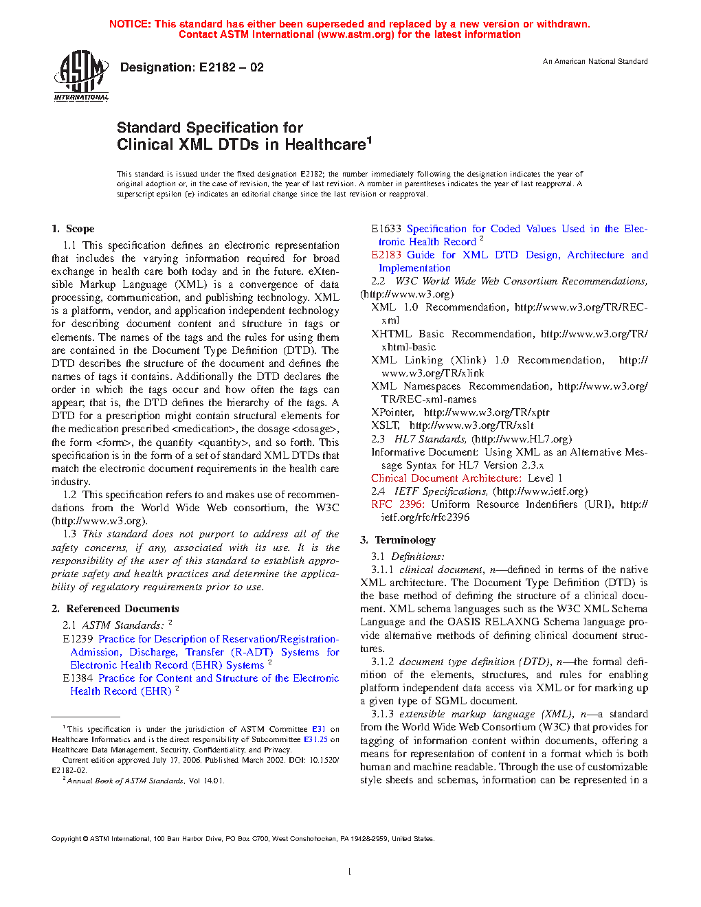 1.1 This specification defines an electronic representation that includes the varying information required for broad exchange in health care both today and in the future. eXtensible Markup Language (XML) is a convergence of data processing, communication, and publishing technology. XML is a platform, vendor, and application independent technology for describing document content and structure in tags or elements. The names of the tags and the rules for using them are contained in the Document Type Definition (DTD). The DTD describes the structure of the document and defines the names of tags it contains. Additionally the DTD declares the order in which the tags occur and how often the tags can appear; that is, the DTD defines the hierarchy of the tags. A DTD for a prescription might contain structural elements for the medication prescribed medication>, the dosage dosage>, the form form>, the quantity quantity>, and so forth. This specification is in the form of a set of standard XML DTDs that match the electronic document requirements in the health care industry.