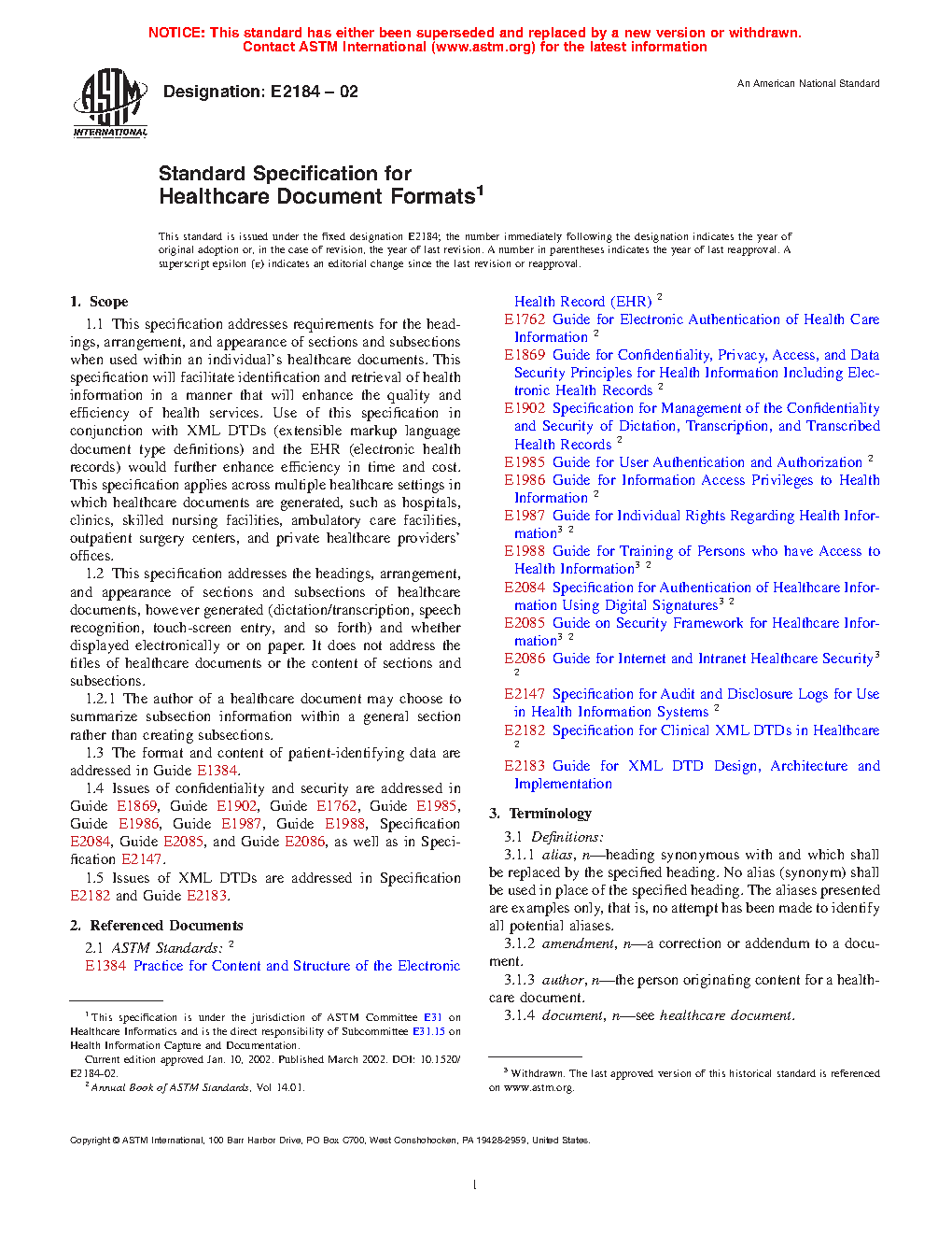1.4 Issues of confidentiality and security are addressed in Guide E 1869, Guide E 1902, Guide E 1762, Guide E 1985, Guide E 1986, Guide E 1987, Guide E 1988, Specification E 2084, Guide E 2085, and Guide E 2086, as well as in Specification E 2147.