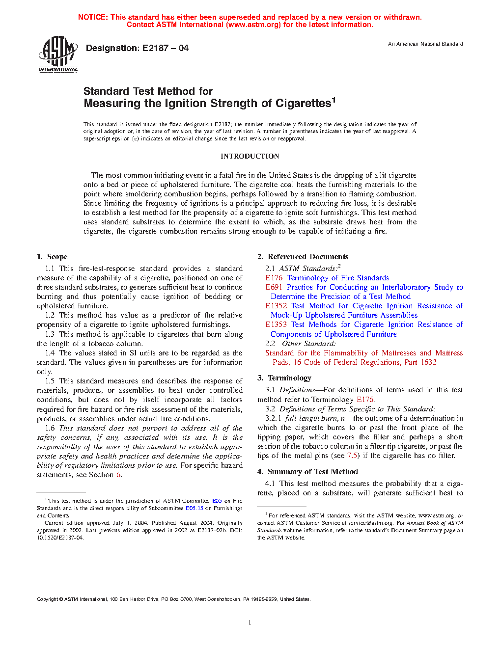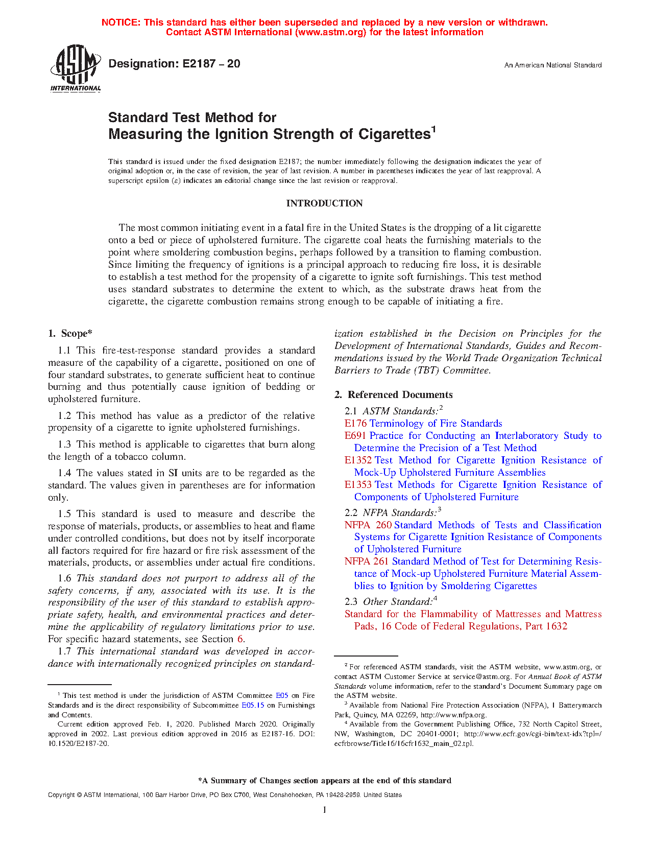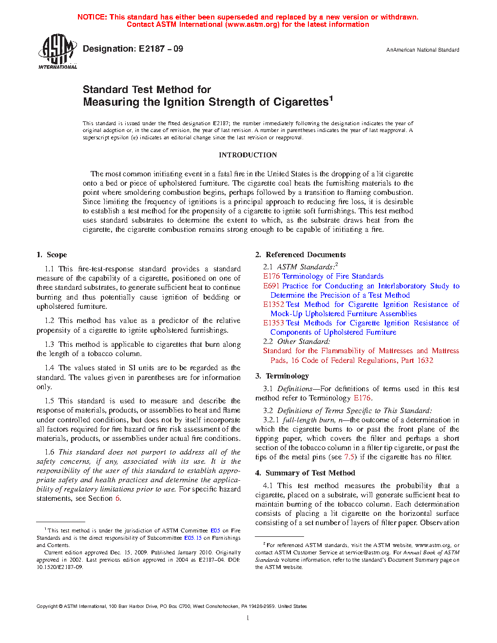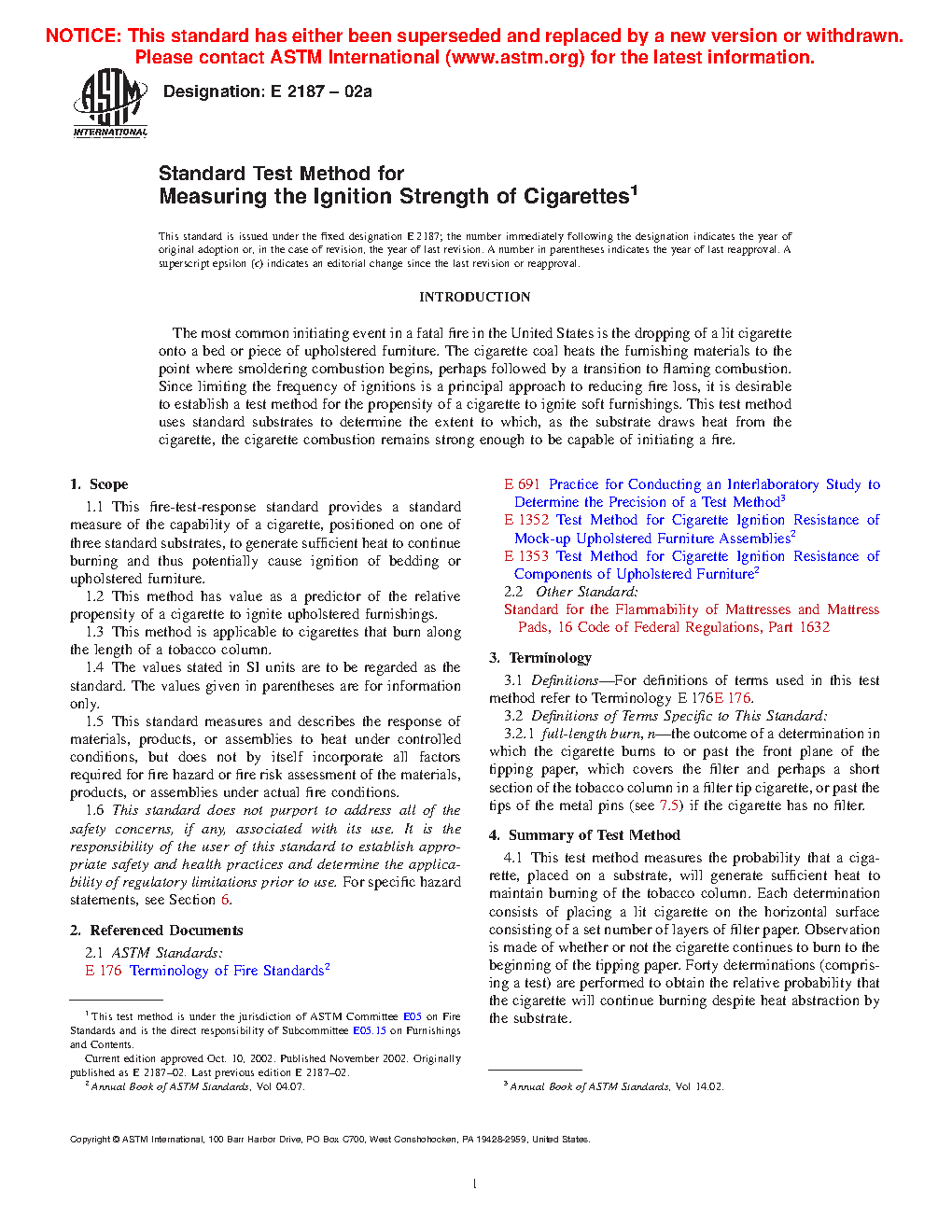 1.1 This fire-test-response standard provides a standard measure of the capability of a cigarette, positioned on one of four standard substrates, to generate sufficient heat to continue burning and thus potentially cause ignition of bedding or upholstered furniture.