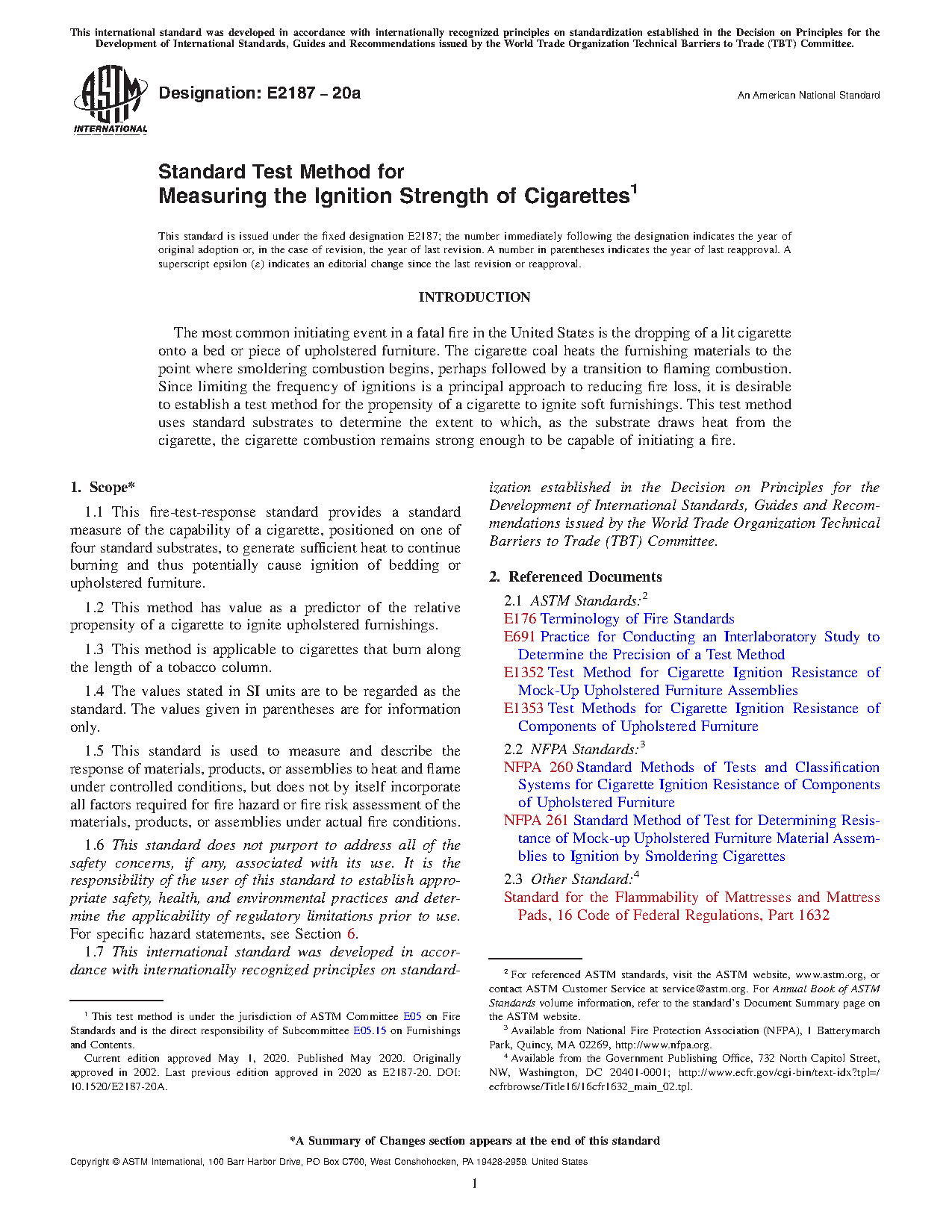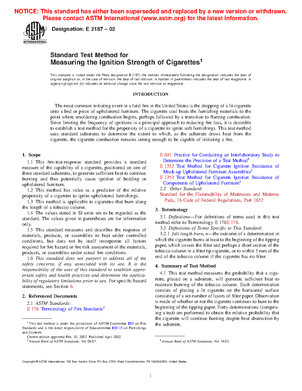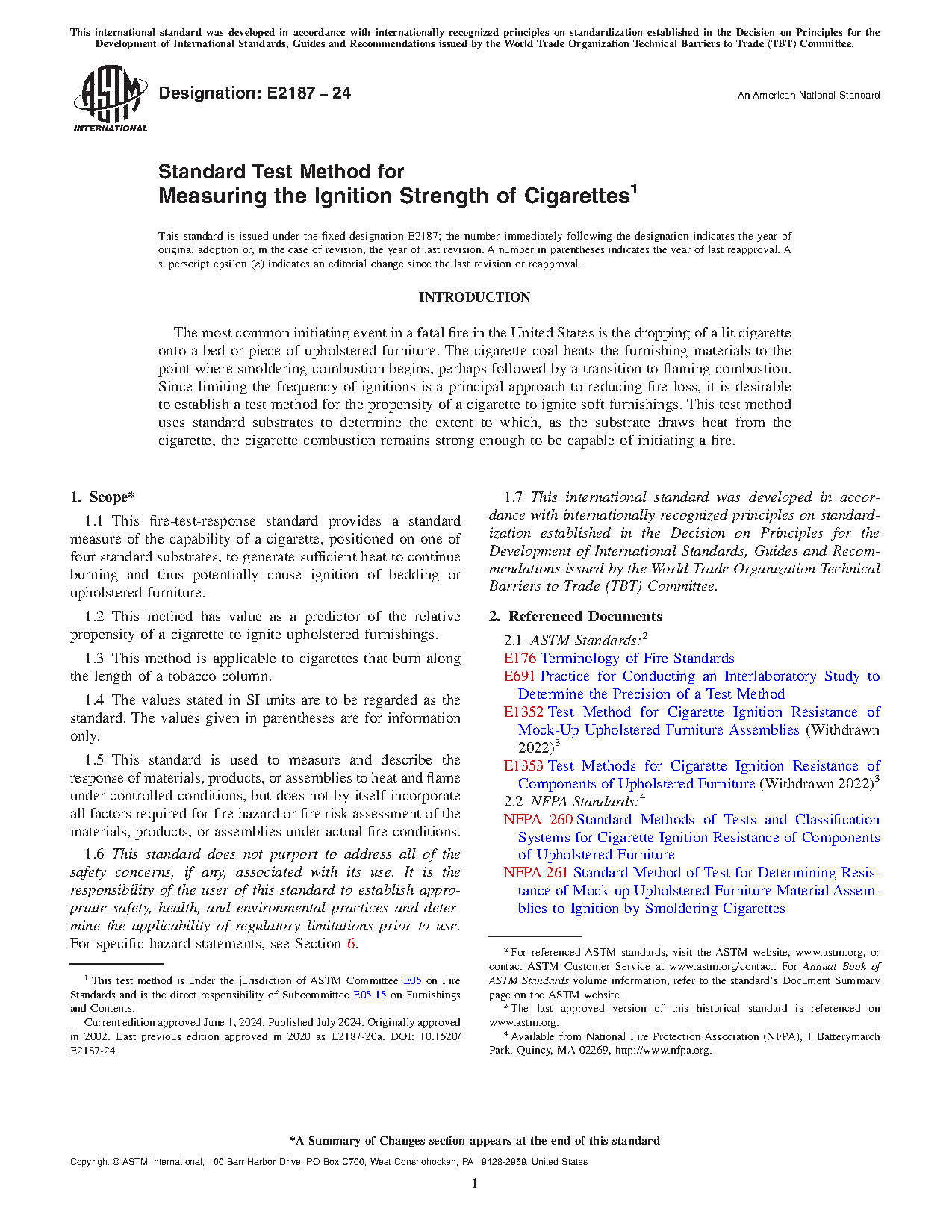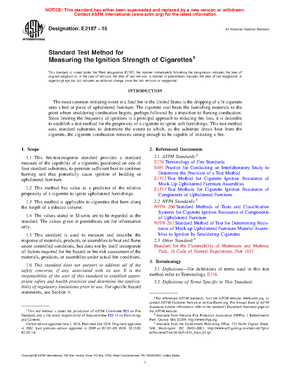 1.1 This fire-test-response standard provides a standard measure of the capability of a cigarette, positioned on one of four standard substrates, to generate sufficient heat to continue burning and thus potentially cause ignition of bedding or upholstered furniture.