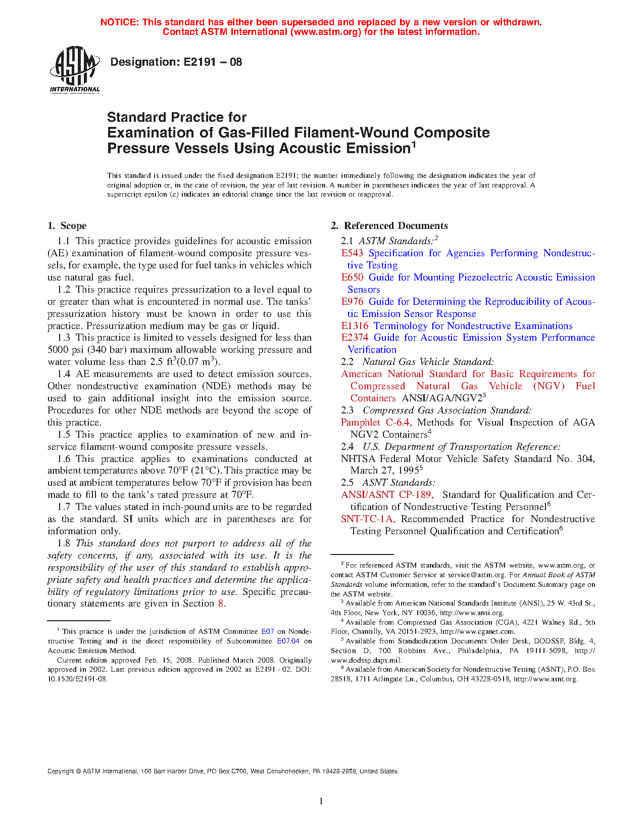 1.1 This practice provides guidelines for acoustic emission (AE) examination of filament-wound composite pressure vessels, for example, the type used for fuel tanks in vehicles which use natural gas fuel.
