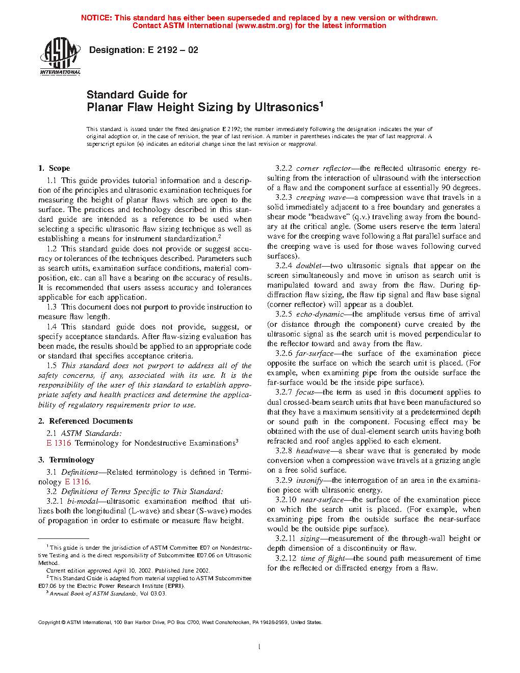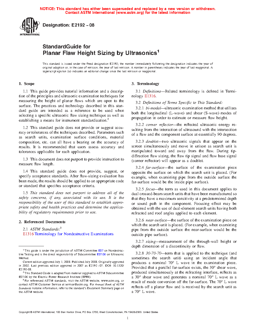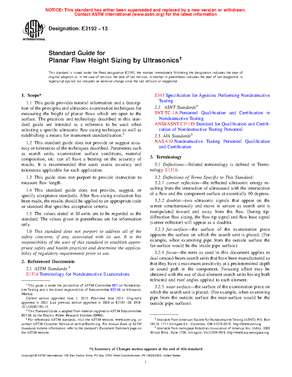 The techniques outlined describe proven ultrasonic flaw sizing practices and their associated limitations, using refracted longitudinal wave and shear wave techniques as applied to ferritic or austenitic components. Other materials may be examined using this guide with appropriate standardization reference blocks. The practices described are applicable to both manual and automated examinations.