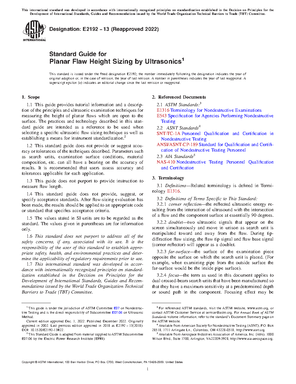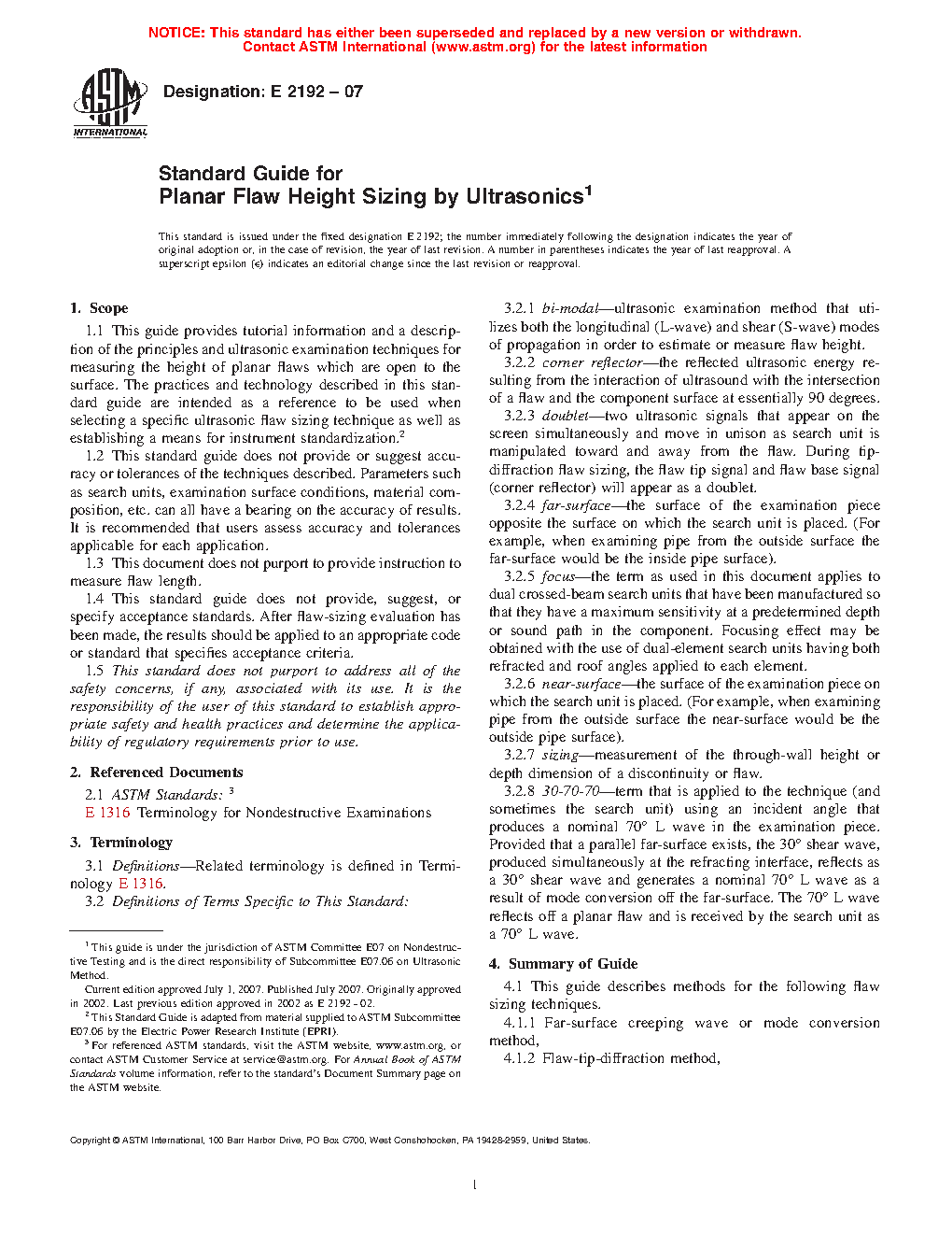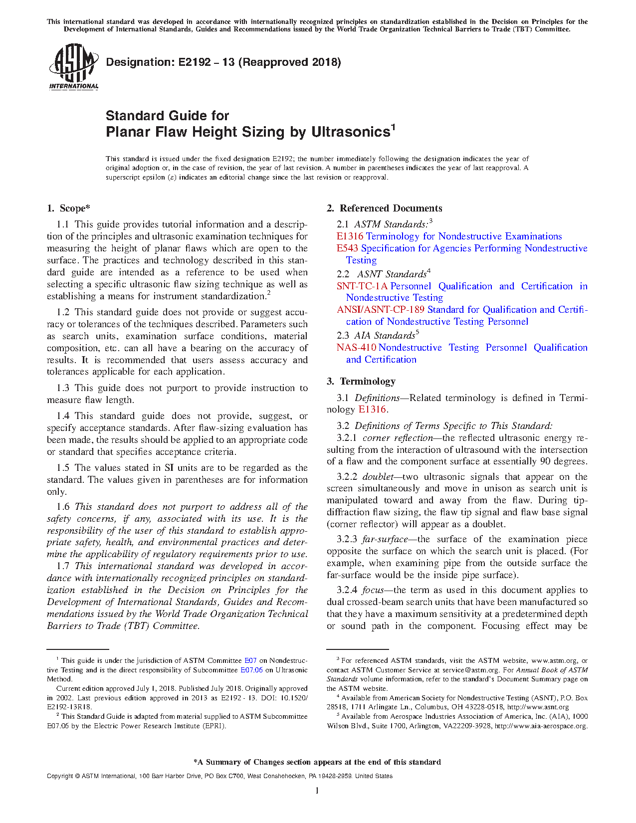 The techniques outlined describe proven ultrasonic flaw sizing practices and their associated limitations, using refracted longitudinal wave and shear wave techniques as applied to ferritic or austenitic components. Other materials may be examined using this guide with appropriate standardization reference blocks. The practices described are applicable to both manual and automated examinations.
