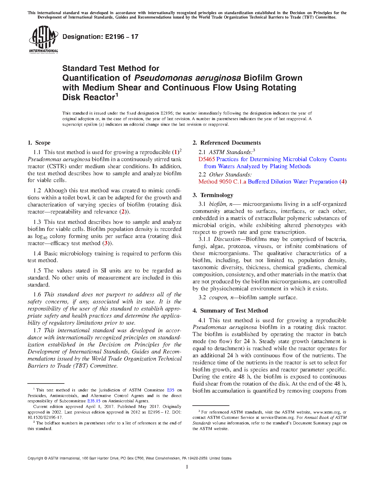 1.1 This test method is used for growing a reproducible (1)2 Pseudomonas aeruginosa biofilm in a continuously stirred tank reactor (CSTR) under medium shear conditions. In addition, the test method describes how to sample and analyze biofilm for viable cells.