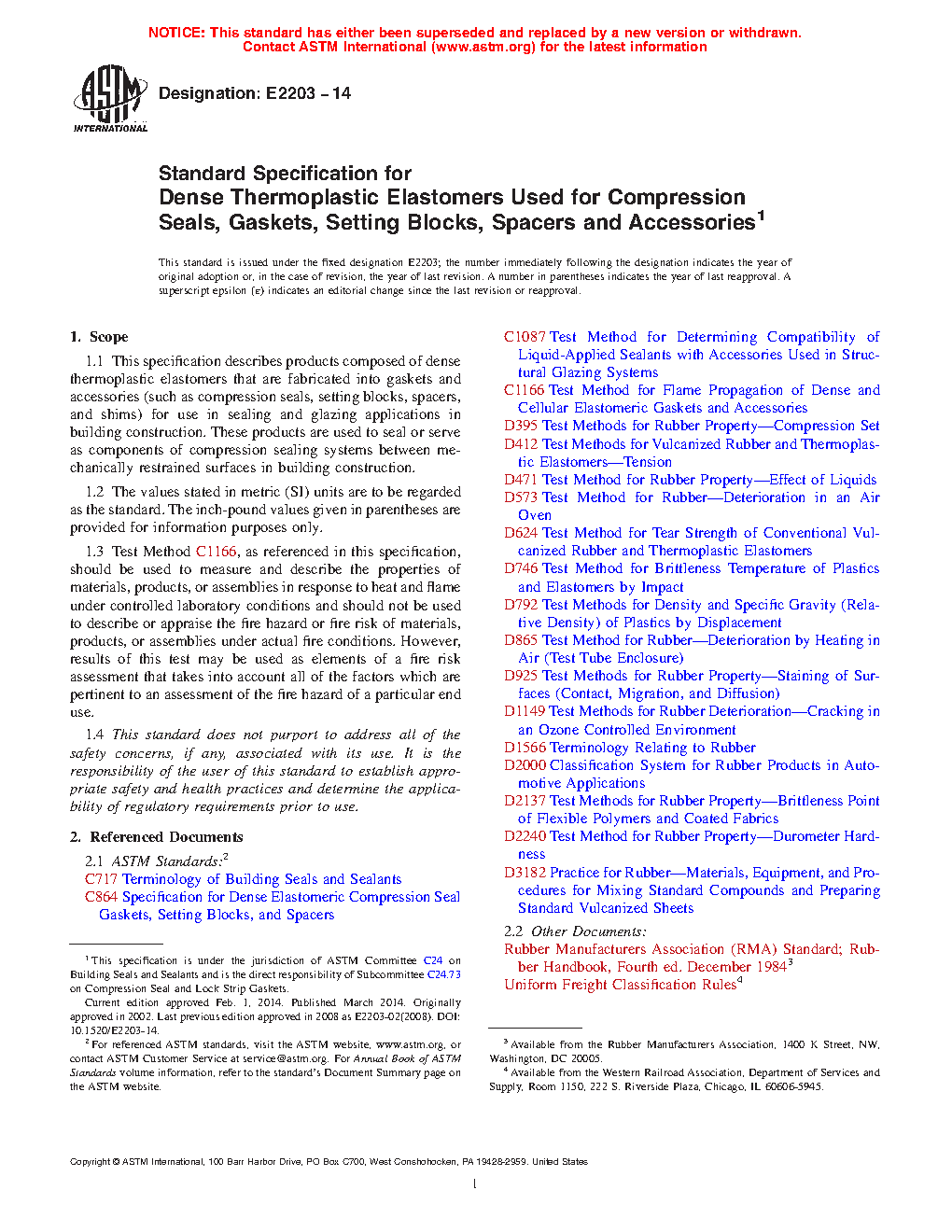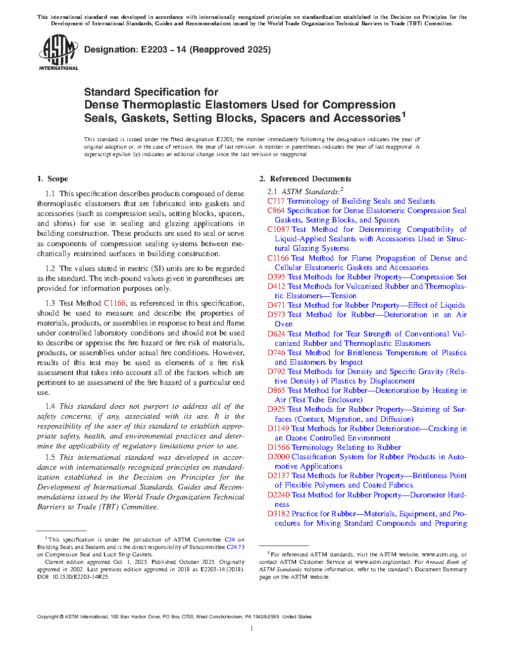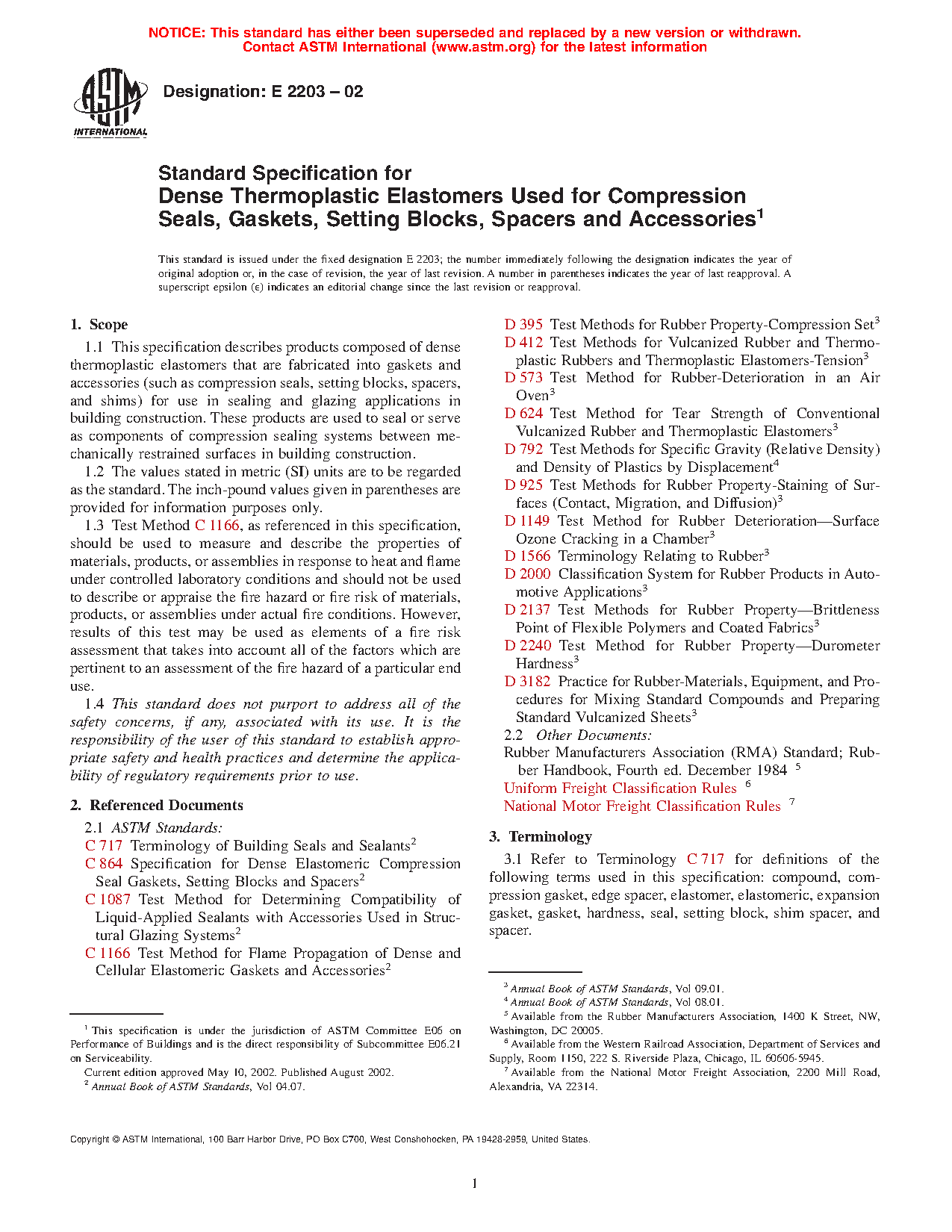 This specification covers the properties of products made from dense thermoplastic elastomers used for compression seals, gaskets, setting blocks, spacers, and accessories for building construction sealing and glazing applications. The products are categorized into types according to resistance to tearing and compression set, grades based on durometer hardness, classes by flame propagation requirements, and into surfaces according to the surface characteristics. All products should be a performed extrusion manufactured from a thermoplastic vulcanizate and should conform to the specified requirements for tensile strength, elongation at break, hardness, ozone resistance, compression set, heat aging, tear resistance, brittleness temperature, and water absorption.