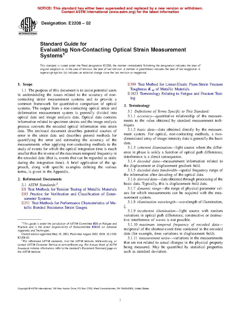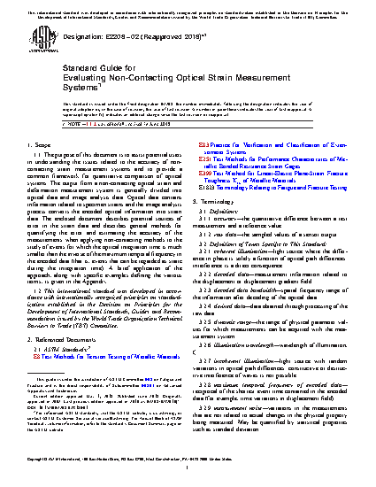This guide assists potential users in understanding the issues related to the accuracy of non-contacting strain measurement systems and to provide a common framework for quantitative comparison of optical systems. The output from a non-contacting optical strain and deformation measurement system is generally divided into optical data and image analysis data. Each non-contacting optical strain measurement system must be evaluated to determine reliable estimates for the accuracy of the resulting Derived Data.