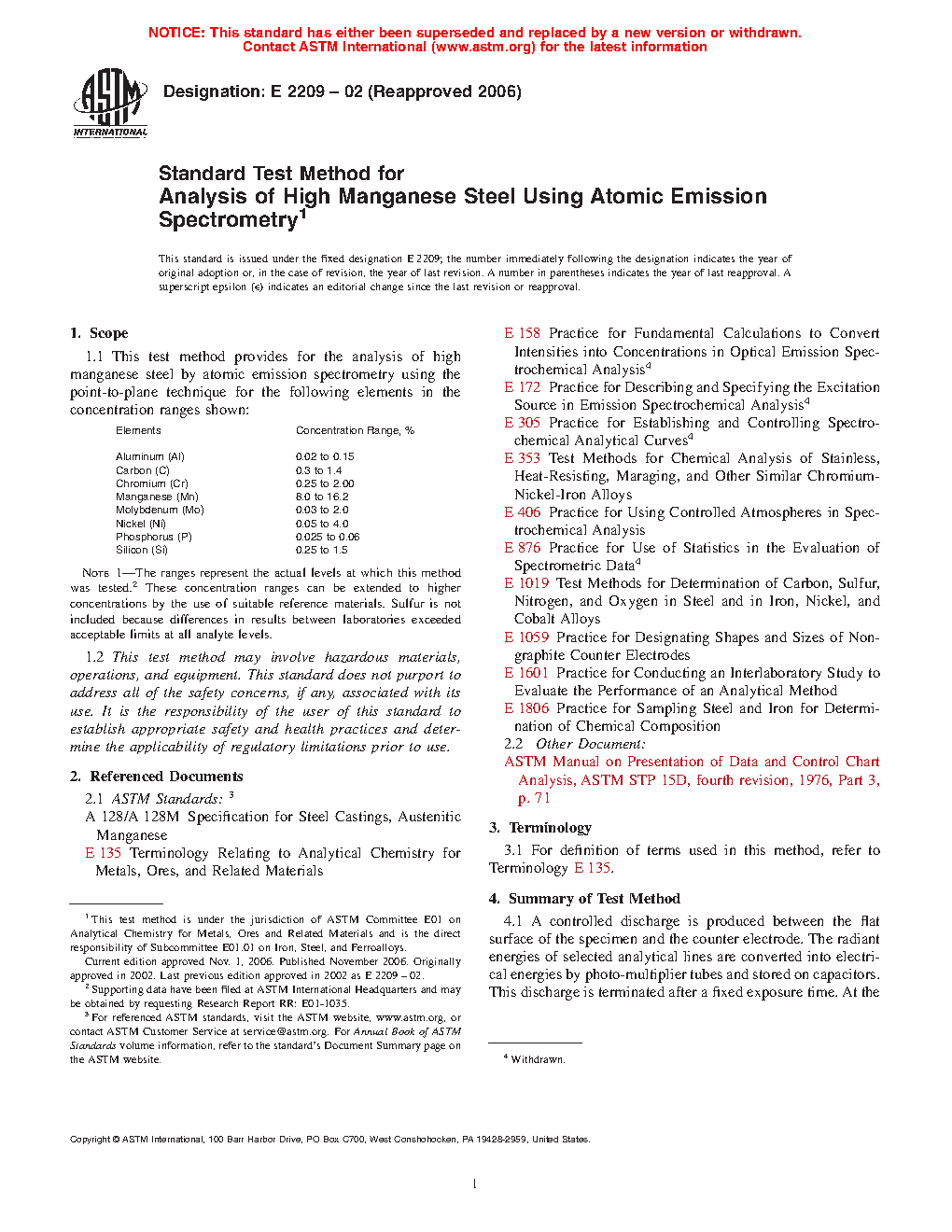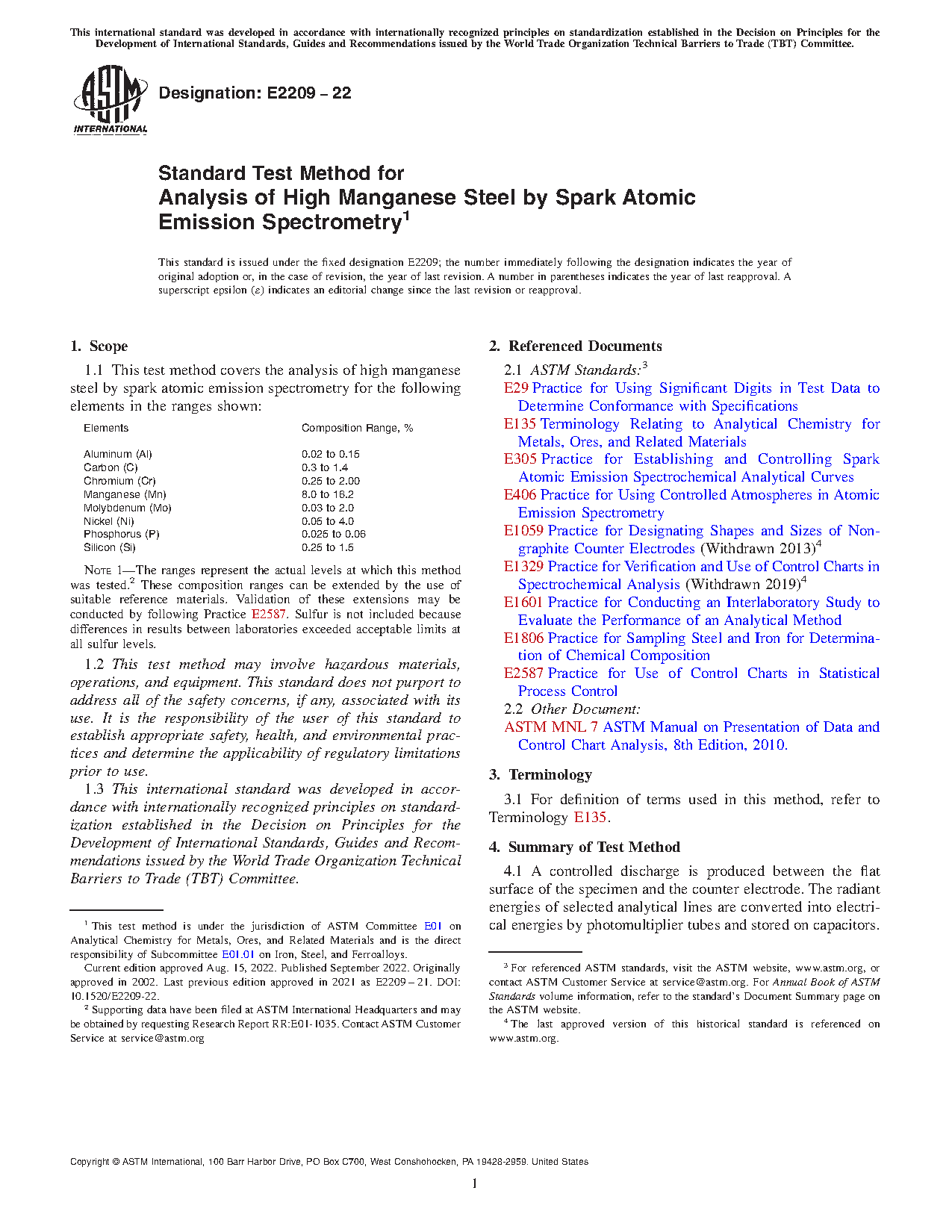 1.1 This test method provides for the analysis of high manganese steel by spark atomic emission spectrometry for the following elements in the ranges shown: