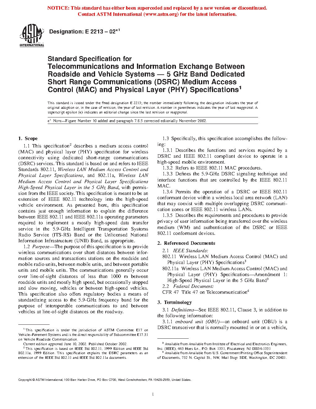 1.1 This specification2 describes a medium access control (MAC) and physical layer (PHY) specification for wireless connectivity using dedicated short-range communications (DSRC) services. This standard is based on and refers to IEEE Standards 802.11, “Wireless LAN Medium Access Control and Physical Layer Specifications,” and 802.11a, “Wireless LAN Medium Access Control and Physical Layer Specifications High-Speed Physical Layer in the 5 GHz Band,” with permission from the IEEE Society. This specification is meant to be an extension of IEEE 802.11 technology into the high-speed vehicle environment. As presented here, this specification contains just enough information to explain the difference between IEEE 802.11 and IEEE 802.11a operating parameters required to implement a mostly high-speed data transfer service in the 5.9 GHz Intelligent Transportation Systems Radio Service (ITS-RS) band. Potential operations within the Unlicensed National Information Infrastructure (UNII) band are also addressed, as appropriate.