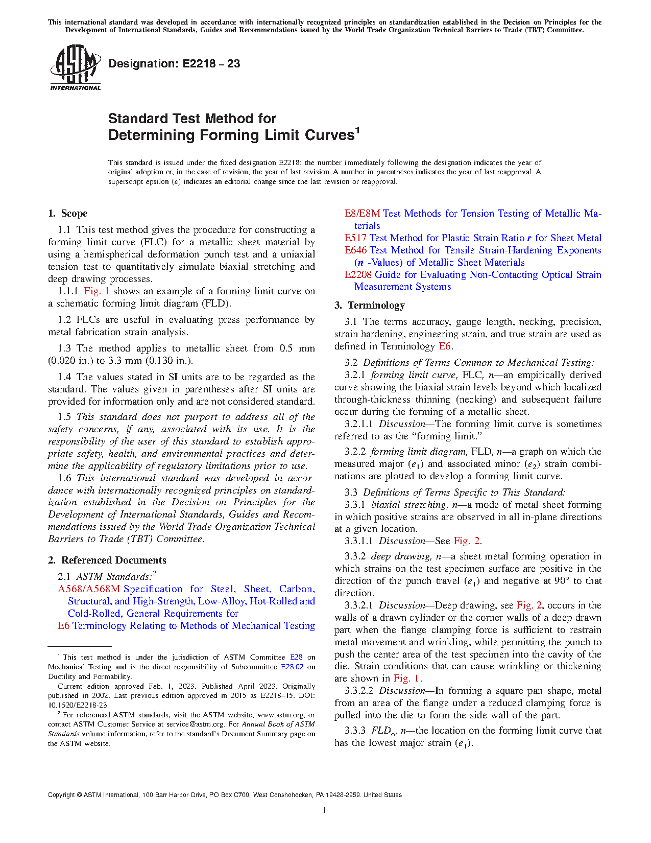 1.1 This method gives the procedure for constructing a forming limit curve (FLC) for a metallic sheet material by using a hemispherical deformation punch test and a uniaxial tension test to quantitatively simulate biaxial stretch and deep drawing processes.