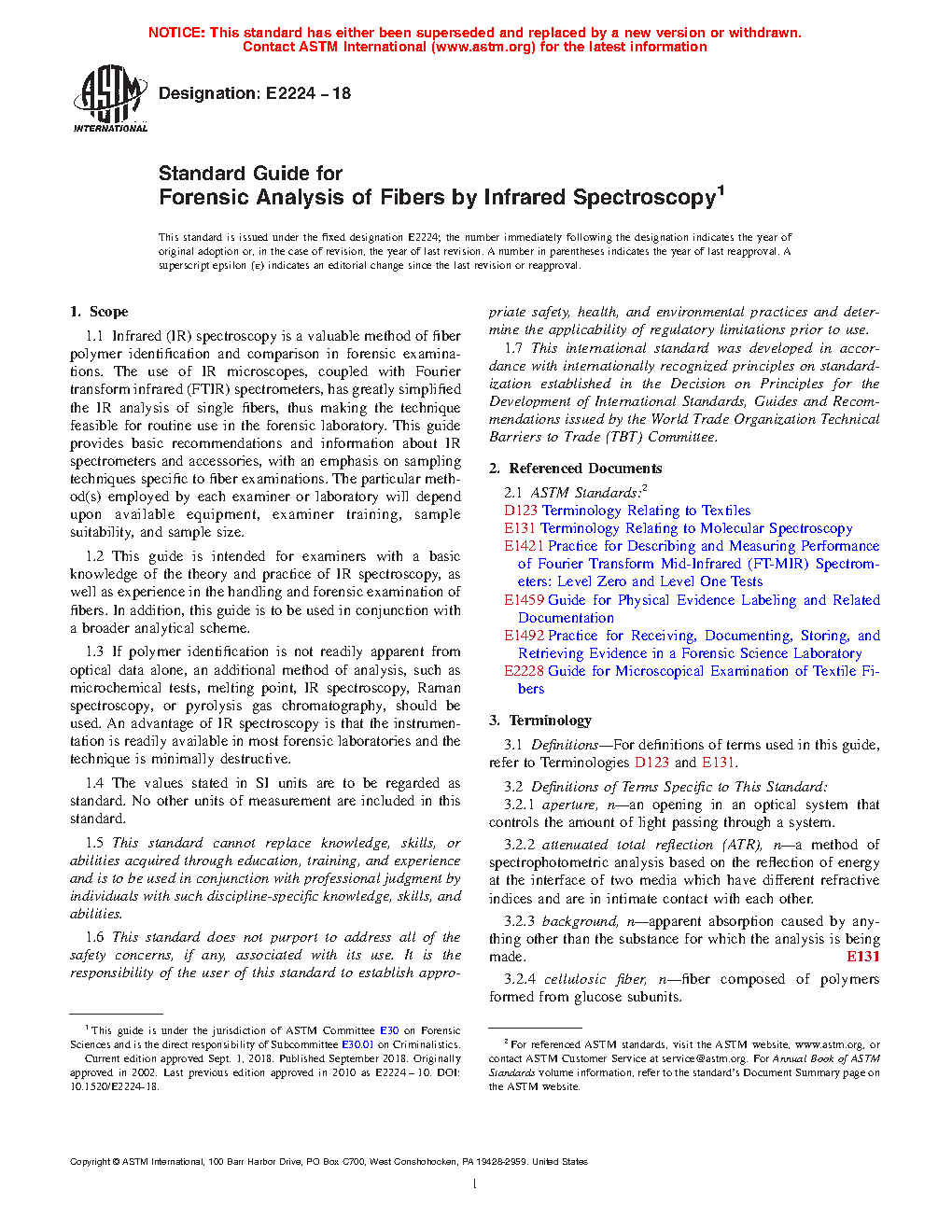 1.1 Infrared (IR) spectroscopy is a valuable method of fiber polymer identification and comparison in forensic examinations. The use of IR microscopes, coupled with Fourier transform infrared (FTIR) spectrometers, has greatly simplified the IR analysis of single fibers, thus making the technique feasible for routine use in the forensic laboratory. This guide provides basic recommendations and information about IR spectrometers and accessories, with an emphasis on sampling techniques specific to fiber examinations. The particular method(s) employed by each examiner or laboratory will depend upon available equipment, examiner training, sample suitability, and sample size.