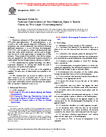 1.1 Metameric coloration of fibers can be detected using UV/visible spectrophotometry. If spectrophotometry is restricted to the visible spectral range only, differences in dye components may remain undetected. One method of detecting additional components is to use thin-layer chromatography (TLC). TLC is an inexpensive, simple, well-documented technique that, under certain conditions, can be used to complement the use of visible spectroscopy in comparisons of fiber colorants. The principle of the method is that the dye components are separated by their differential migration caused by a mobile phase flowing through a porous, adsorptive medium.