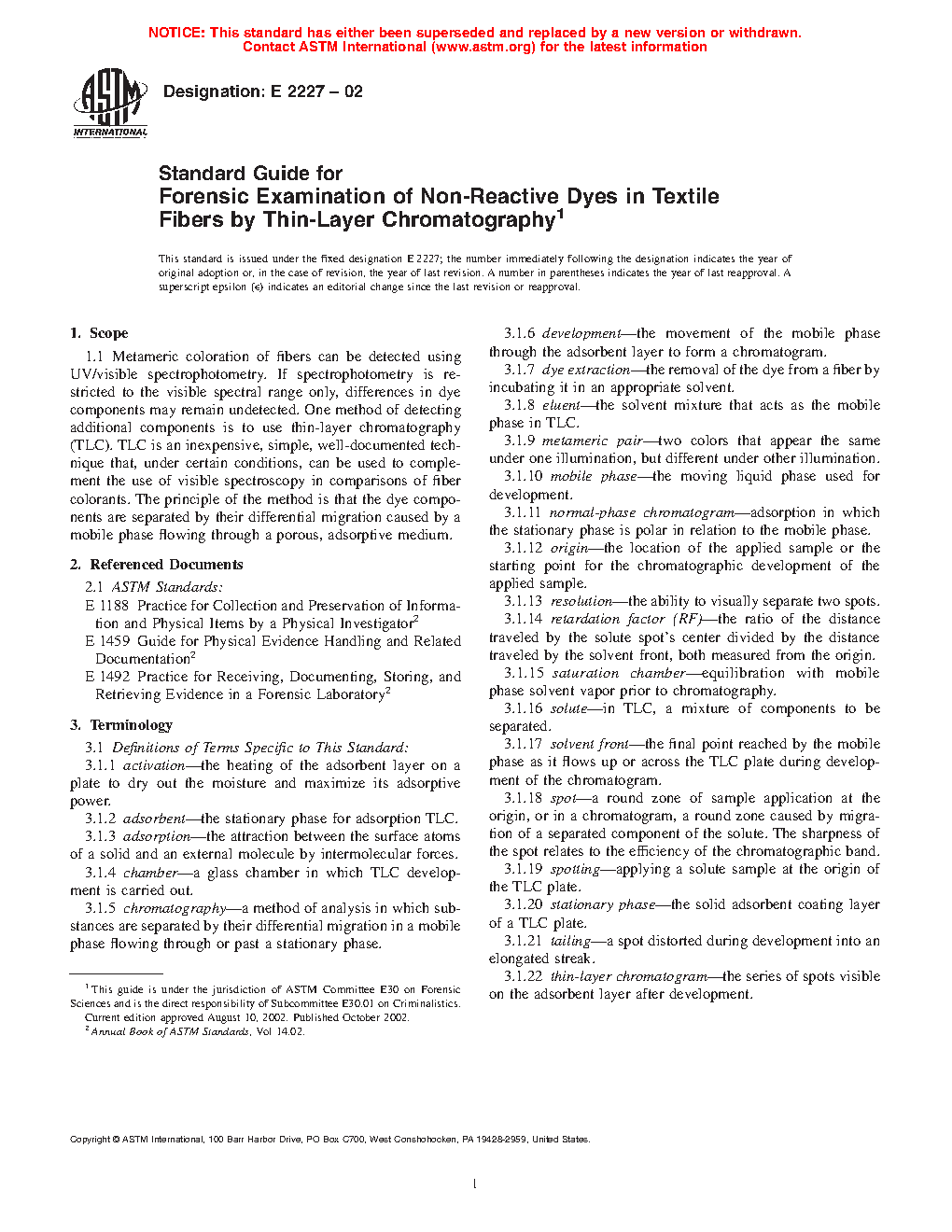 1.1 This guide is intended as an overview of the Thin-Layer Chromatography (TLC) of fiber colorants (or individual dye components) present in dyed fibers. It is intended to be applied within the scope of a broader analytical scheme for the forensic analysis of fiber samples. TLC could provide information that cannot be obtained through other color analyses (such as microspectrophotometry (MSP)) (1).2