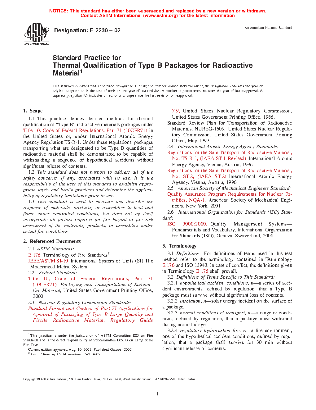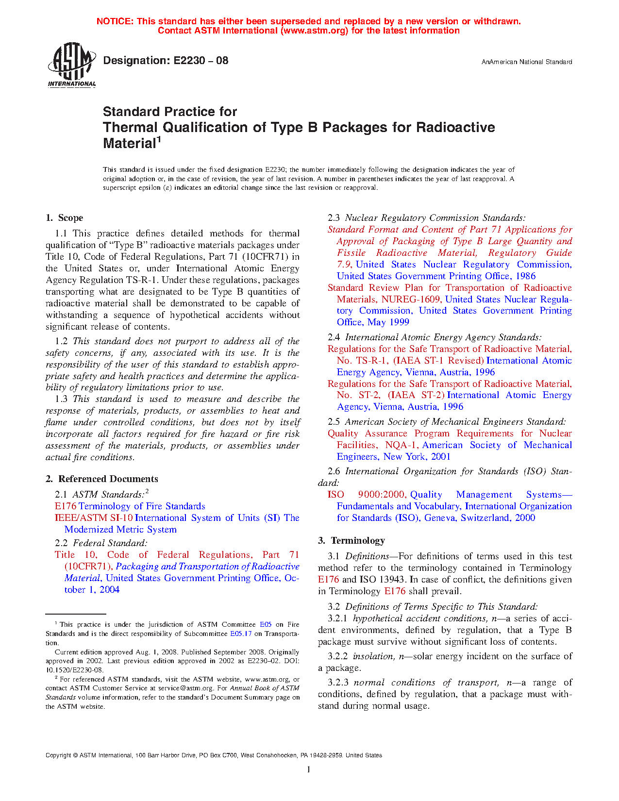 1.1 This practice defines detailed methods for thermal qualification of “Type B” radioactive materials packages under Title 10, Code of Federal Regulations, Part 71 (10CFR71) in the United States or, under International Atomic Energy Agency Regulation TS-R-1. Under these regulations, packages transporting what are designated to be Type B quantities of radioactive material shall be demonstrated to be capable of withstanding a sequence of hypothetical accidents without significant release of contents.