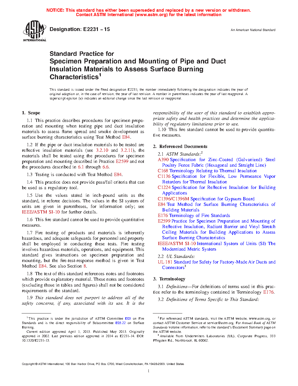 1.1 This practice describes procedures for specimen preparation and mounting when testing pipe and duct insulation materials to assess flame spread and smoke development as surface burning characteristics using Test Method E84.