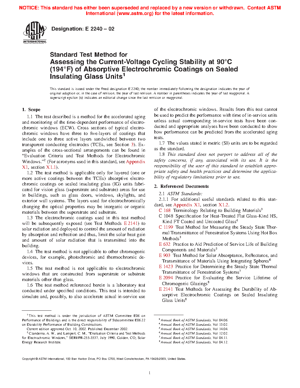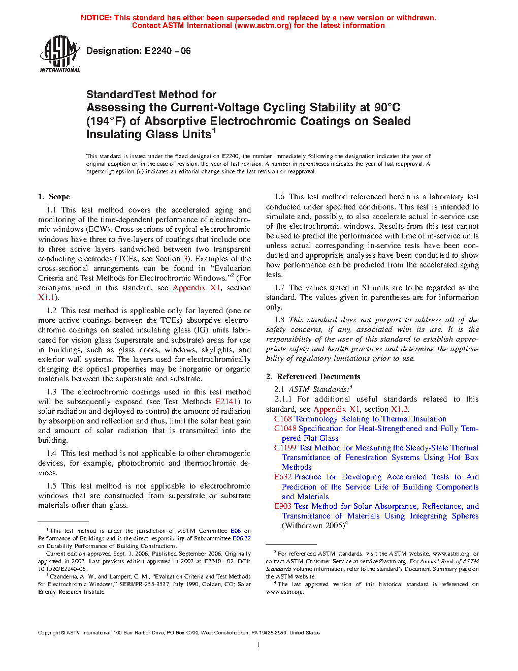 1.1 The test described is a method for the accelerated aging and monitoring of the time-dependent performance of electrochromic windows (ECW). Cross sections of typical electrochromic windows have three to five-layers of coatings that include one to three active layers sandwiched between two transparent conducting electrodes (TCEs, see Section 3). Examples of the cross-sectional arrangements can be found in "Evaluation Criteria and Test Methods for Electrochromic Windows." (For acronyms used in this standard, see Appendix X1, section X1.1).