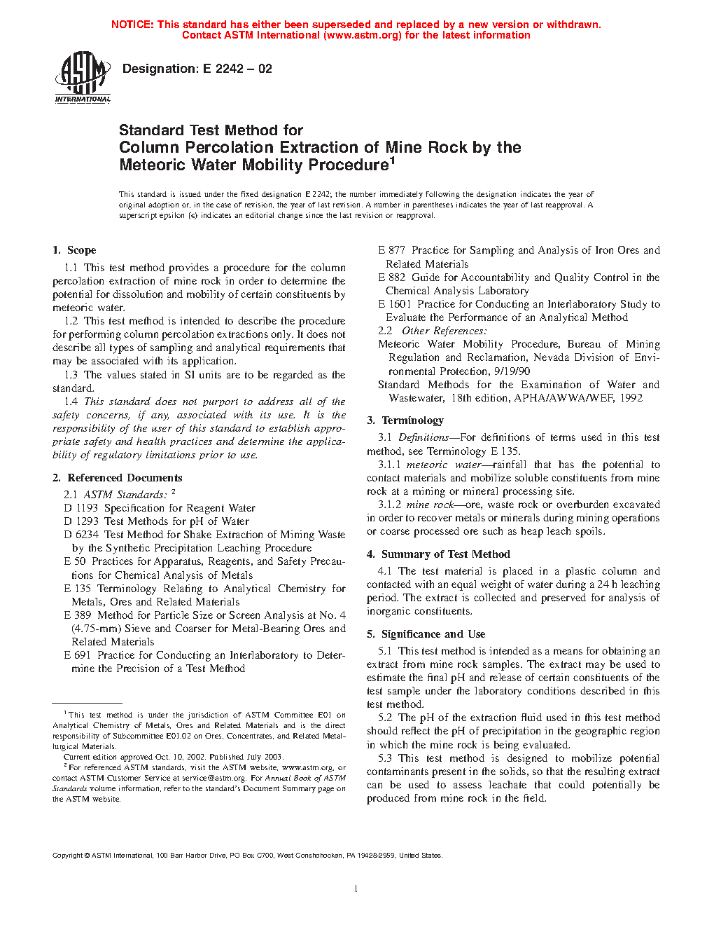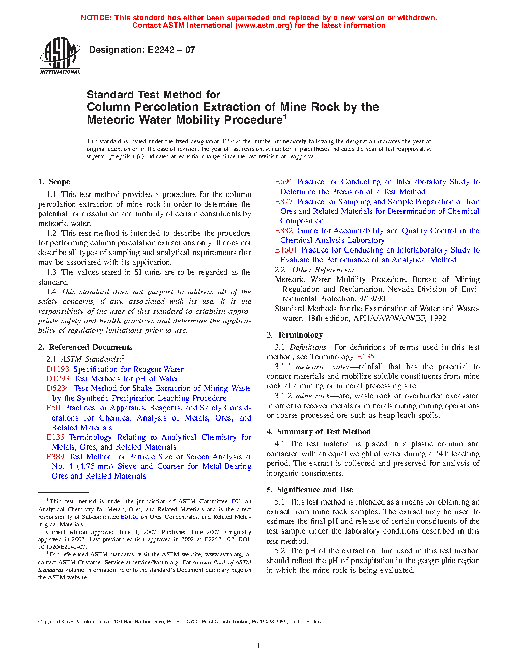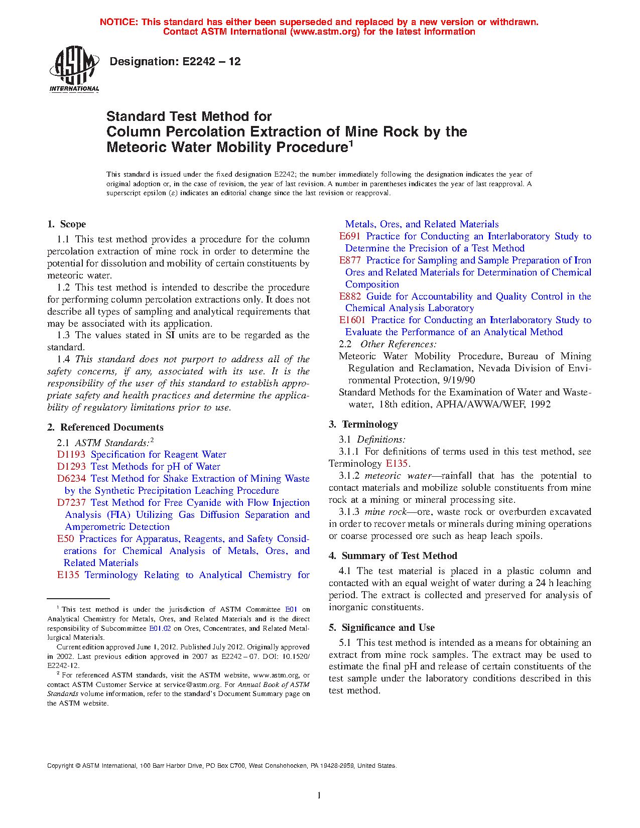 1.1 This test method provides a procedure for the column percolation extraction of mine rock in order to determine the potential for dissolution and mobility of certain constituents by meteoric water.