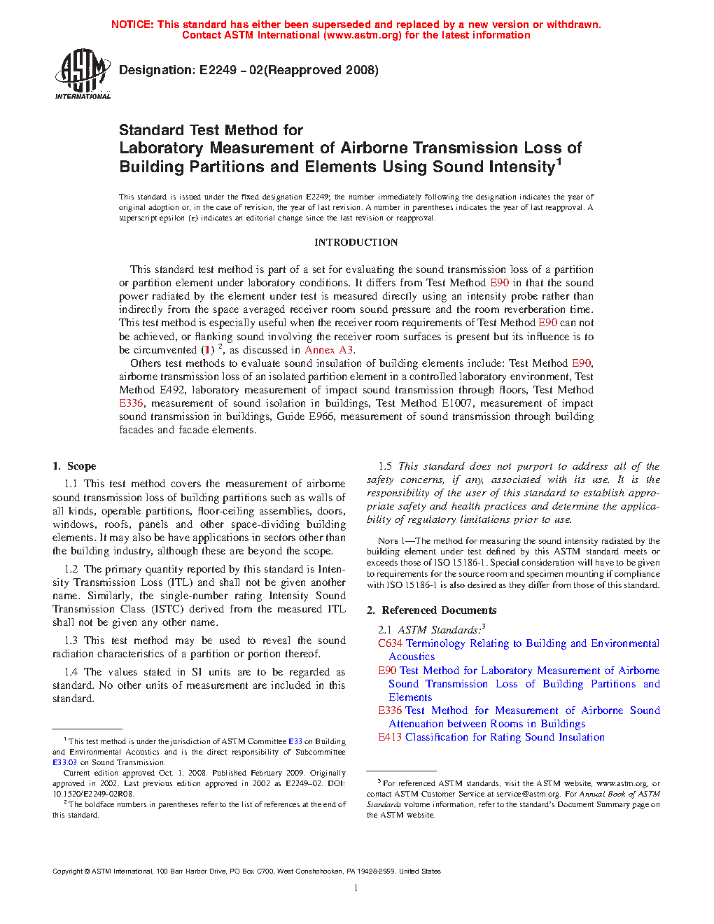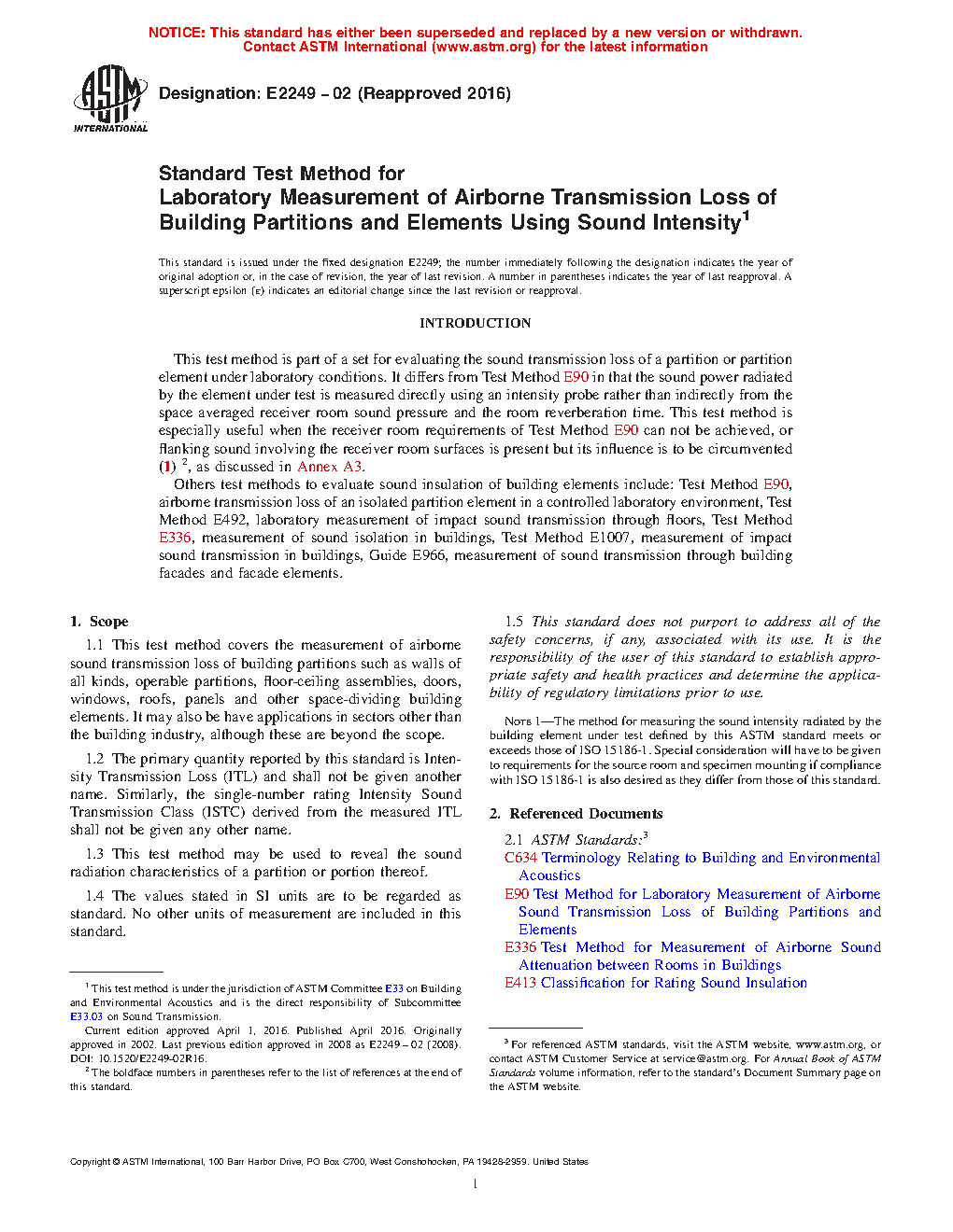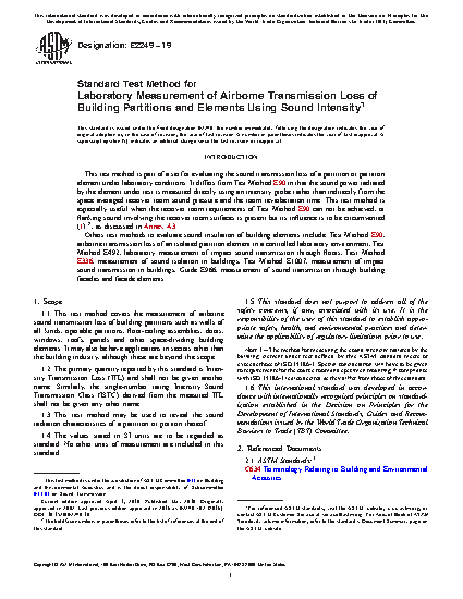 5.2 By appropriately constructing the surface over which the intensity is measured it is possible to selectively exclude the influence of sound energy paths including the effects from joints, gaps as well as flanking sound paths. This method may be particularly useful when accurate measurements of a partition can not be made in an Test Method E90 facility because the partition sound insulation is limited by flanking transmission involving facility source and receiver room surfaces, (for example, the path from the source room floor to the receiver room floor via the isolators and the slab supporting the two). Annex A3 discusses this in detail.