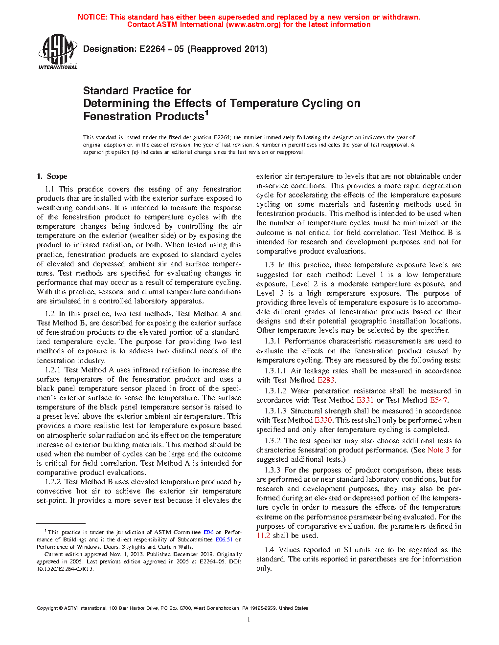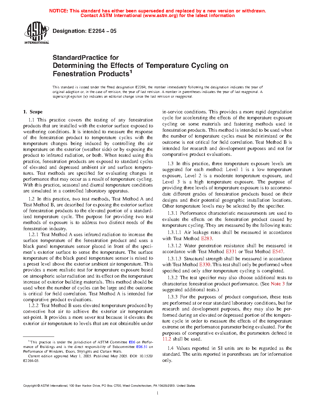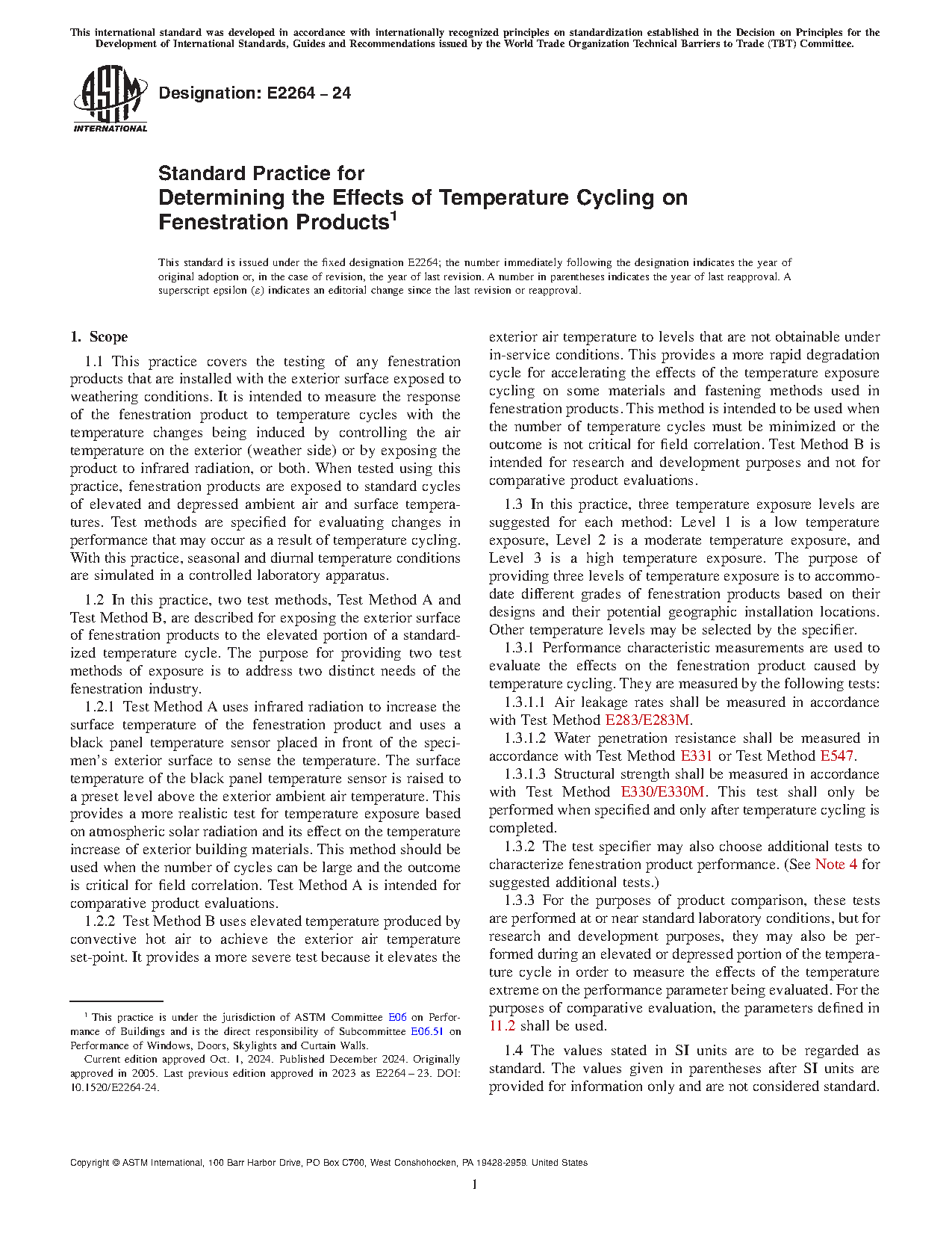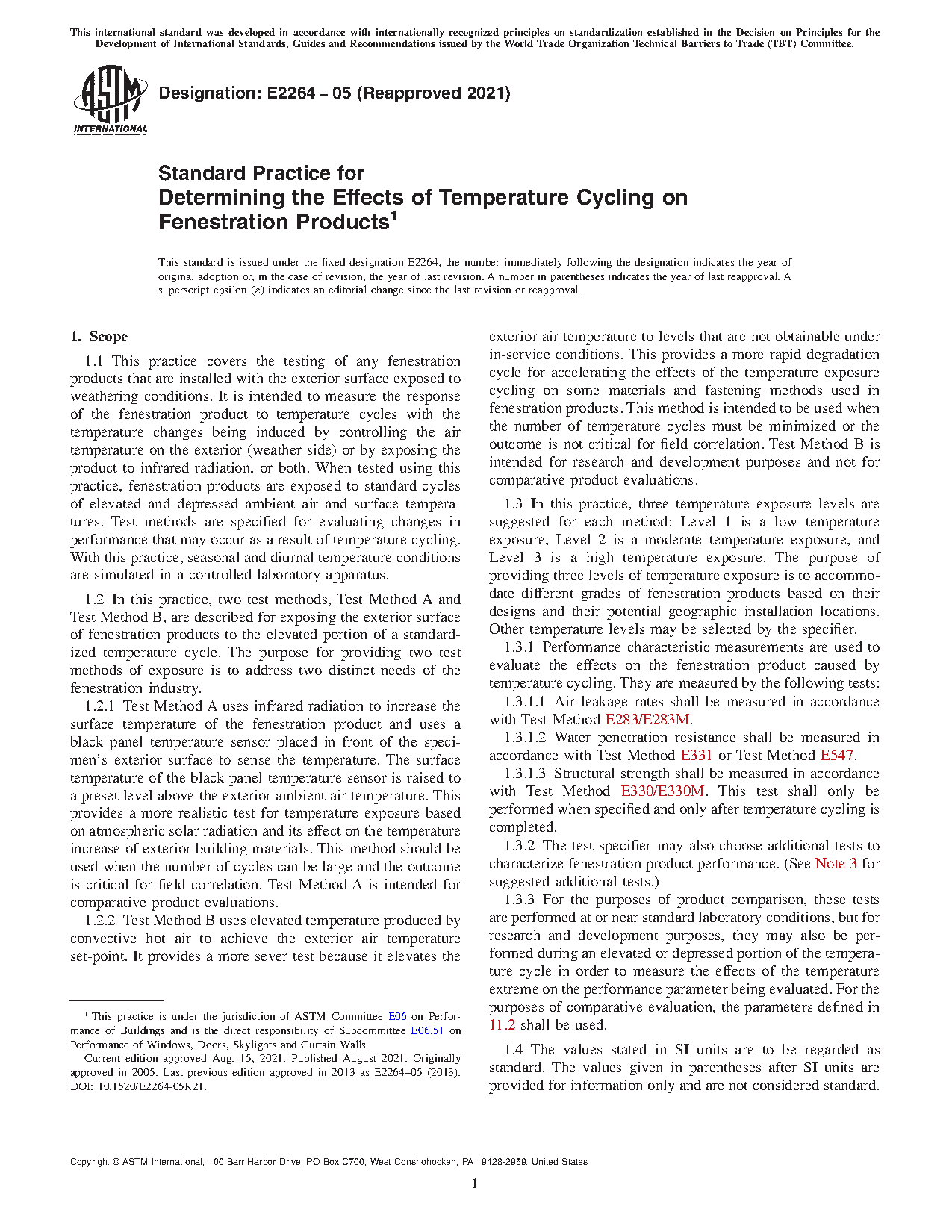 1.2 In this practice, two test methods, Test Method A and Test Method B, are described for exposing the exterior surface of fenestration products to the elevated portion of a standardized temperature cycle. The purpose for providing two test methods of exposure is to address two distinct needs of the fenestration industry.