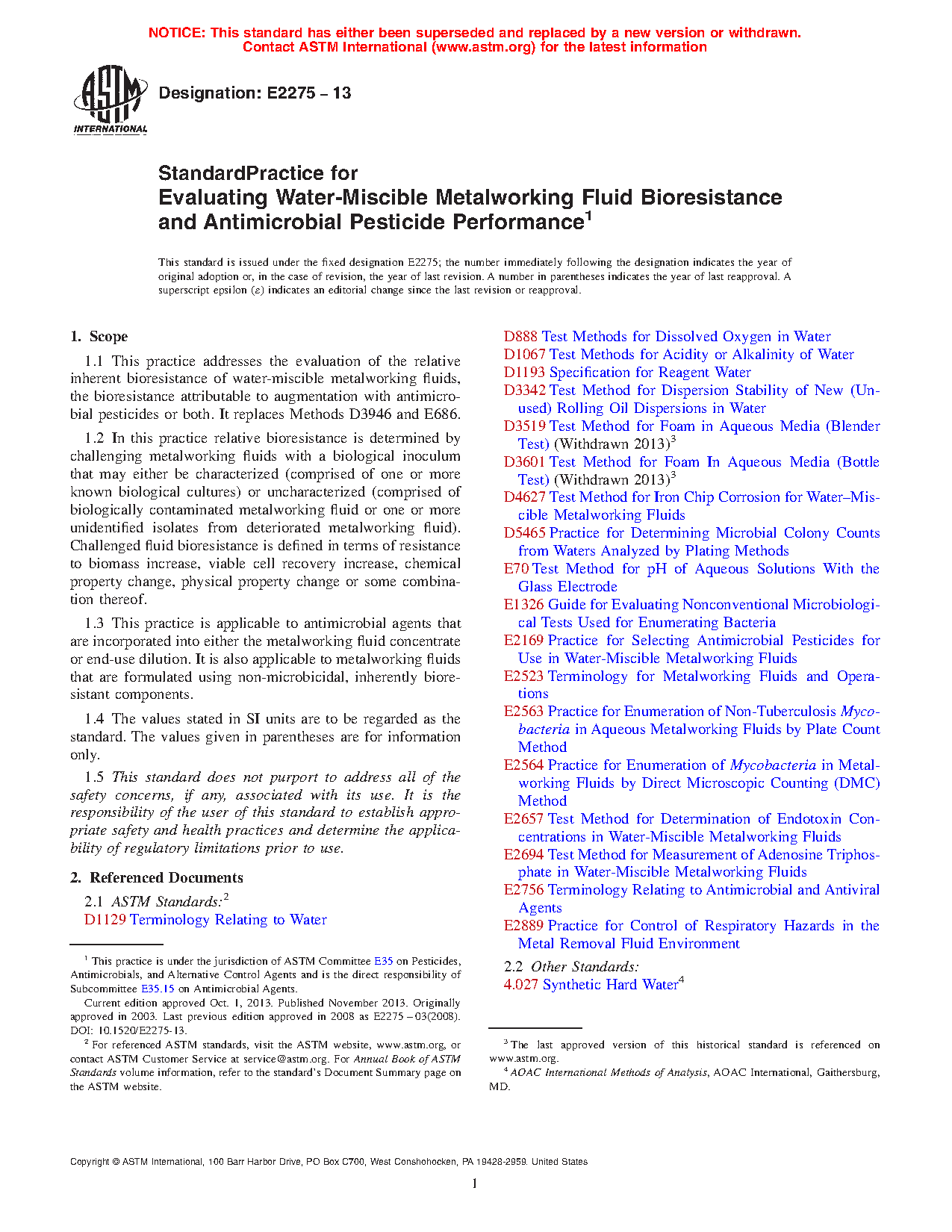 1.3 This practice is applicable to antimicrobial agents that are incorporated into either the metalworking fluid concentrate or end-use dilution. It is also applicable to metalworking fluids that are formulated using non-microbicidal, inherently bioresistant components.