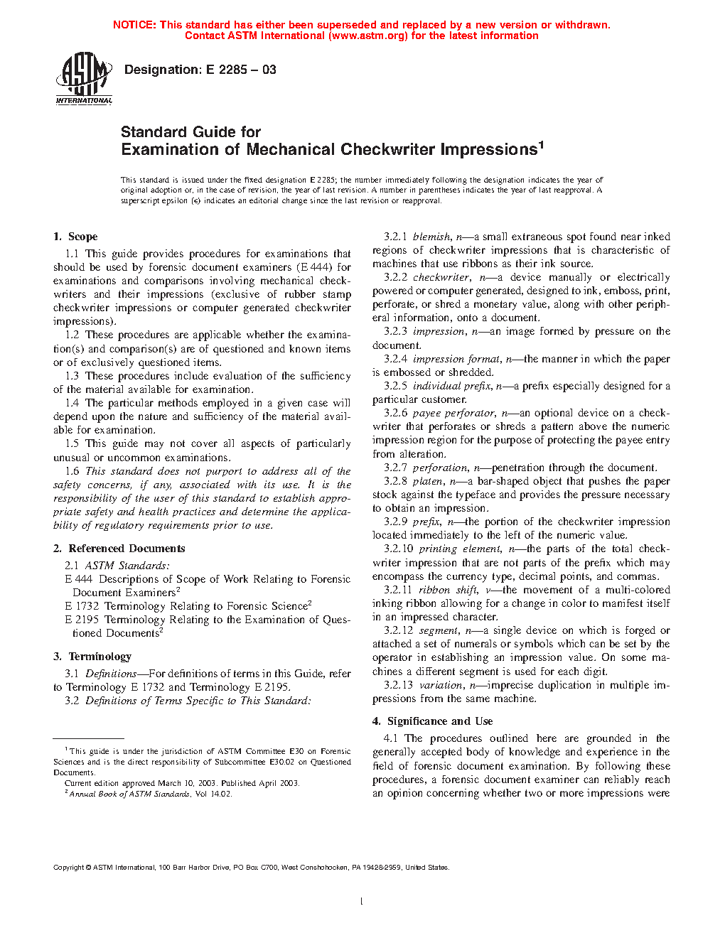 1.1 This guide provides procedures for examinations that should be used by forensic document examiners (E 444) for examinations and comparisons involving mechanical checkwriters and their impressions (exclusive of rubber stamp checkwriter impressions or computer generated checkwriter impressions).