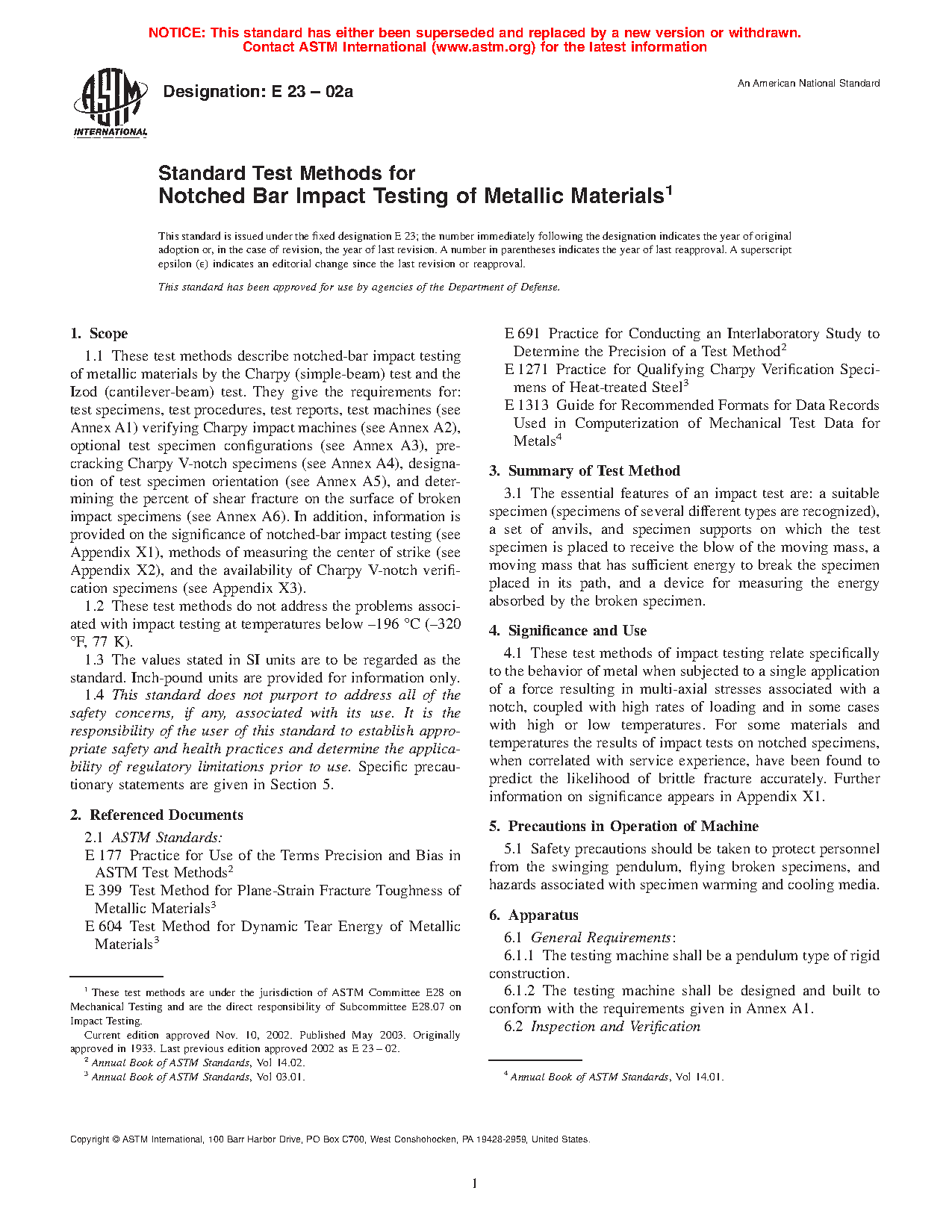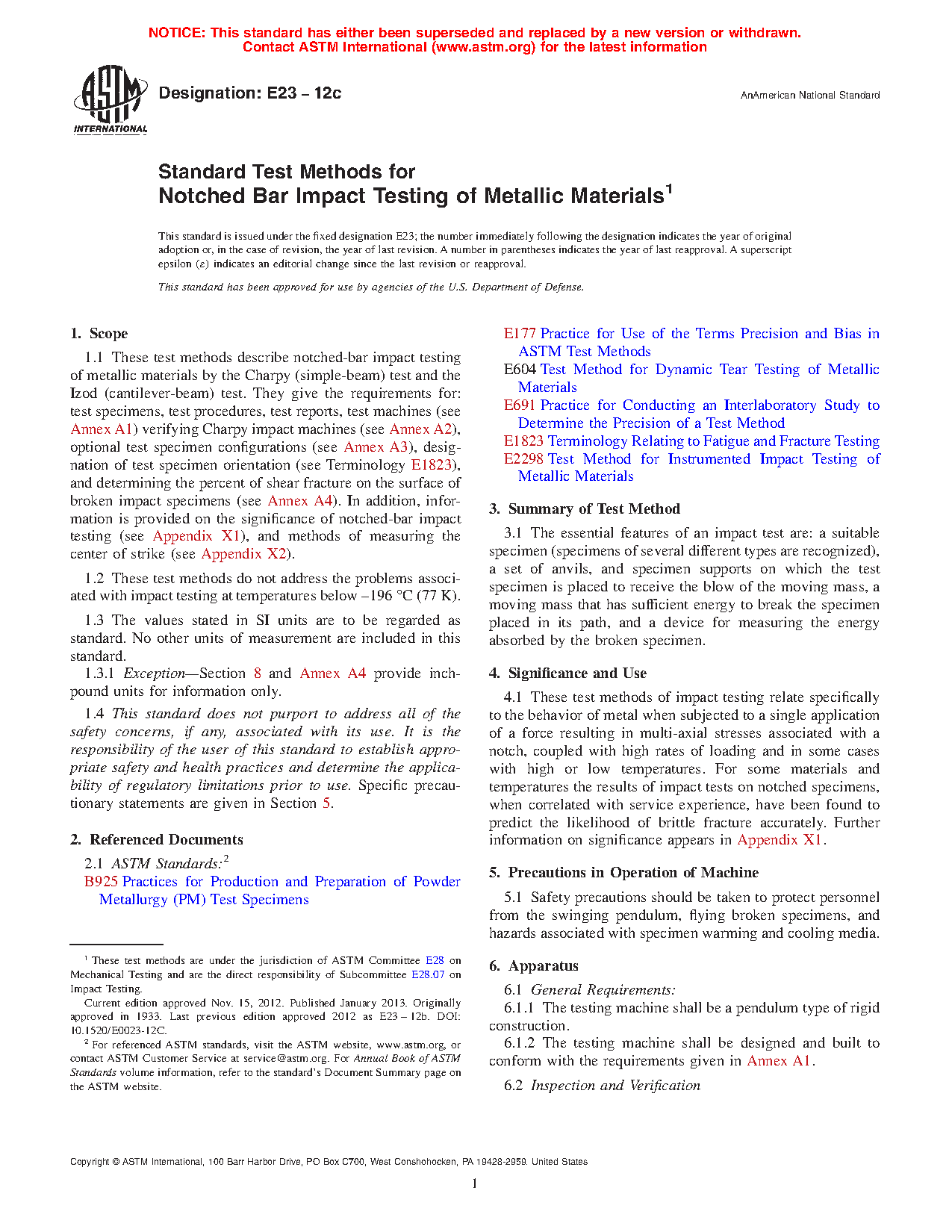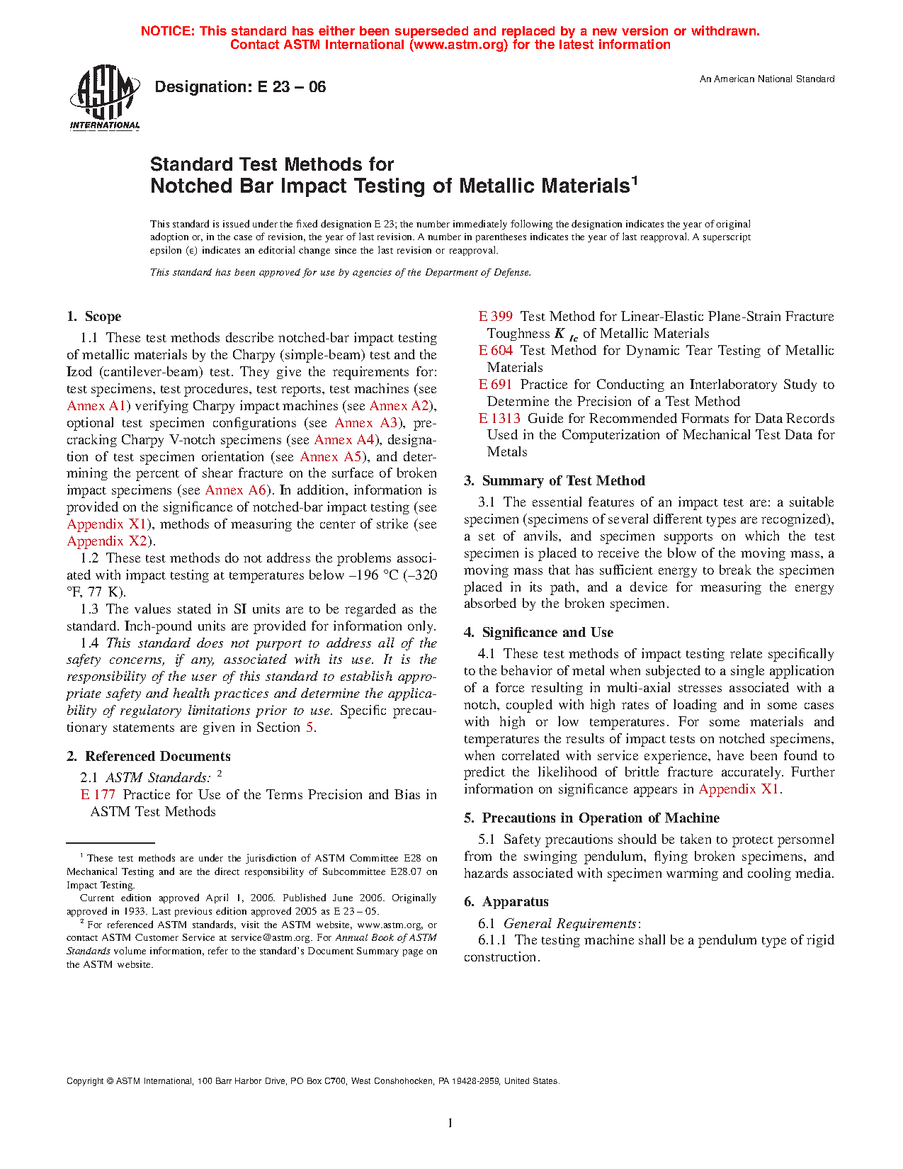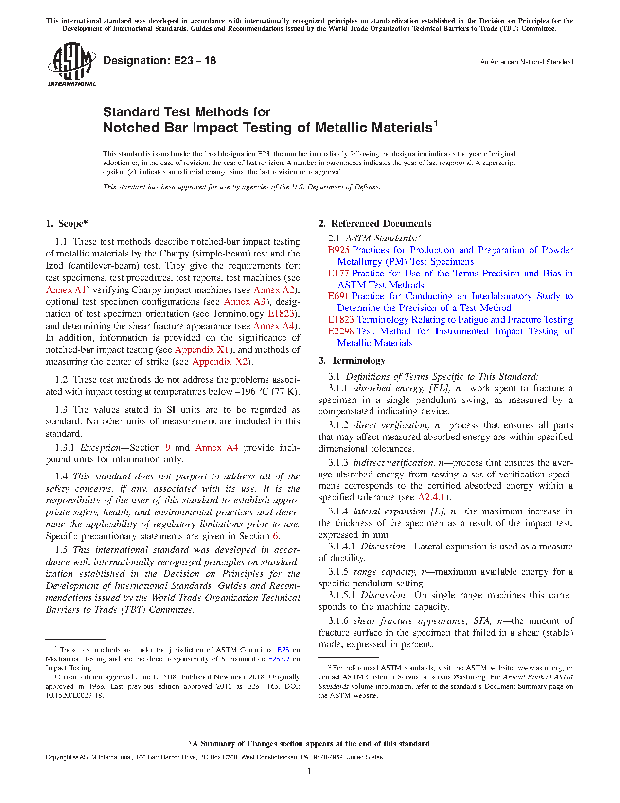 1.1 These test methods describe notched-bar impact testing of metallic materials by the Charpy (simple-beam) test and the Izod (cantilever-beam) test. They give the requirements for: test specimens, test procedures, test reports, test machines (see Annex A1) verifying Charpy impact machines (see Annex A2), optional test specimen configurations (see Annex A3), designation of test specimen orientation (see Terminology E1823), and determining the shear fracture appearance (see Annex A4). In addition, information is provided on the significance of notched-bar impact testing (see Appendix X1), and methods of measuring the center of strike (see Appendix X2).