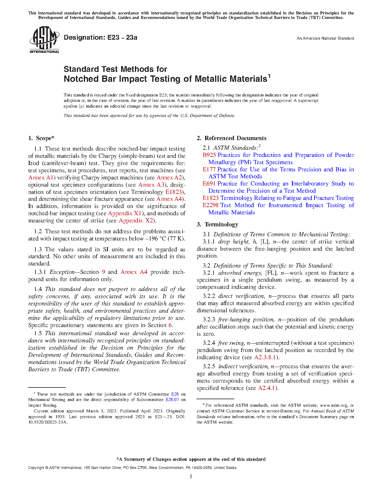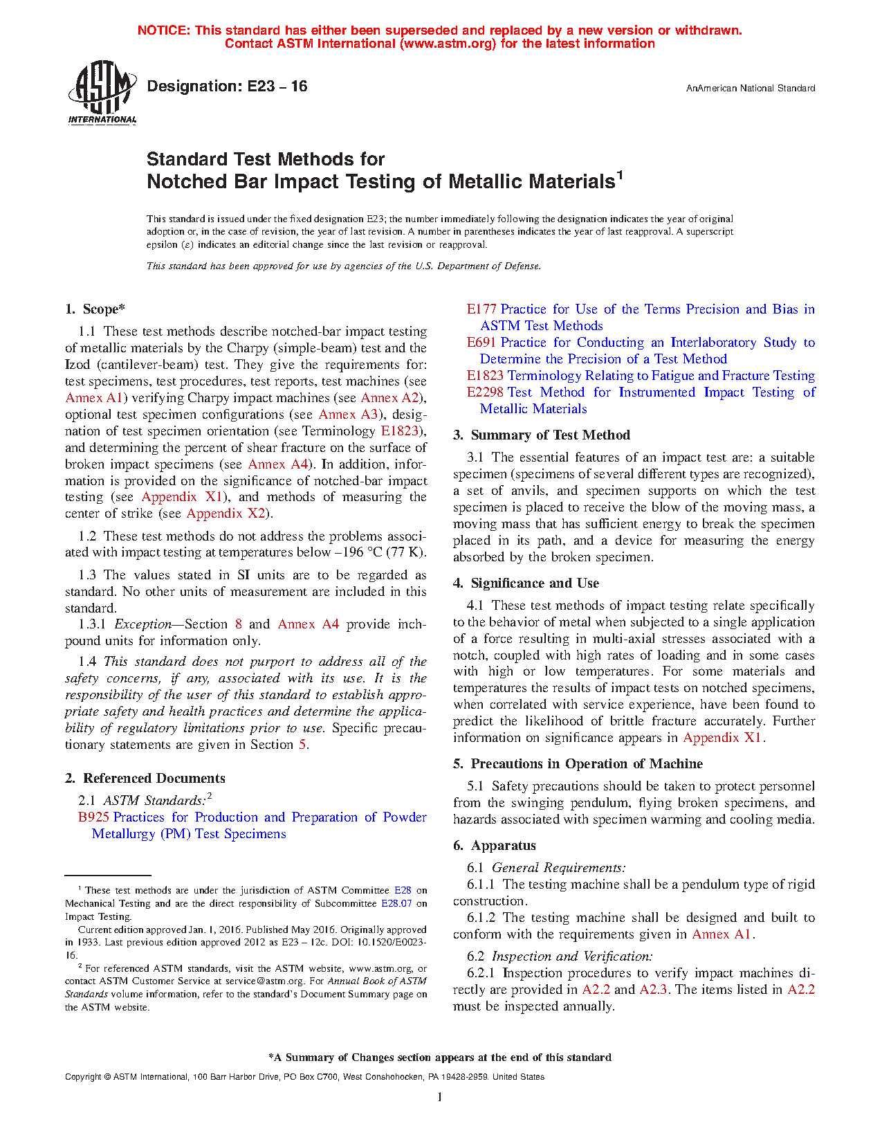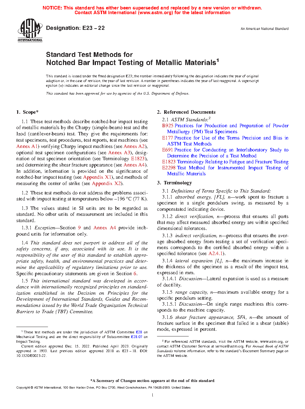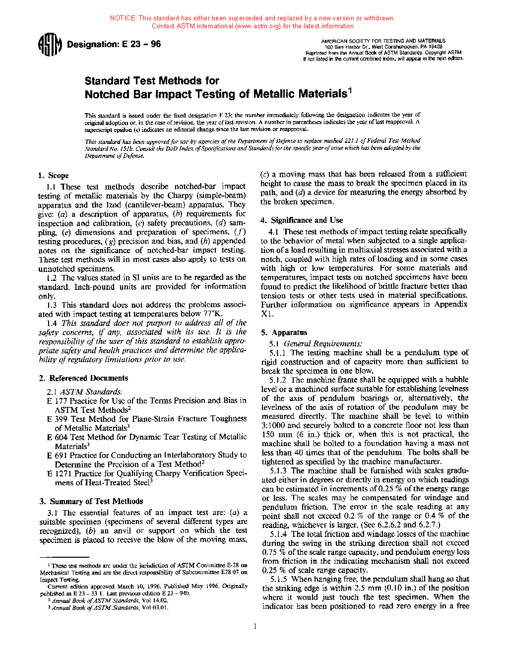 1.1 These test methods describe notched-bar impact testing of metallic materials by the Charpy (simple-beam) test and the Izod (cantilever-beam) test. They give the requirements for: test specimens, test procedures, test reports, test machines (see Annex A1) verifying Charpy impact machines (see Annex A2), optional test specimen configurations (see Annex A3), designation of test specimen orientation (see Terminology E1823), and determining the shear fracture appearance (see Annex A4). In addition, information is provided on the significance of notched-bar impact testing (see Appendix X1), and methods of measuring the center of strike (see Appendix X2).