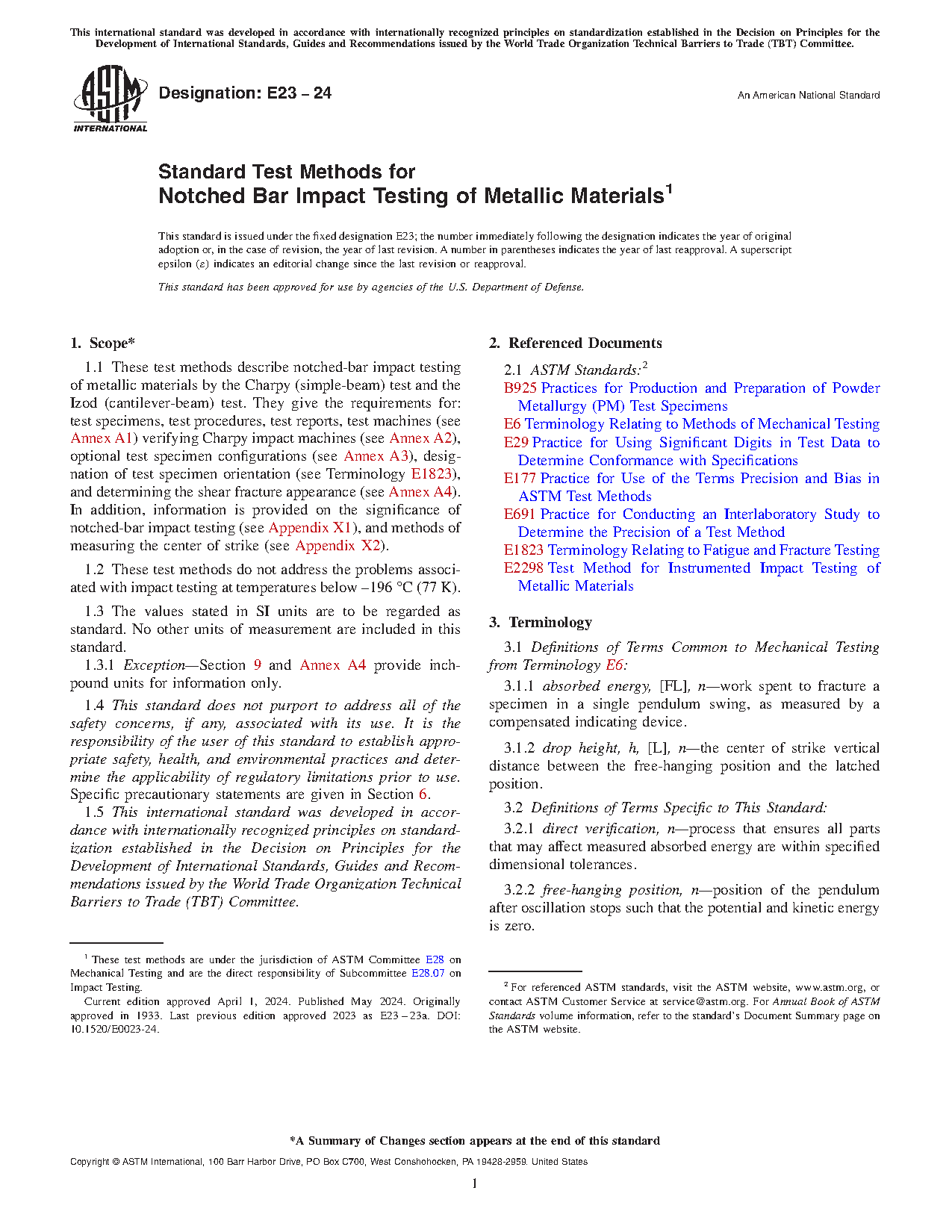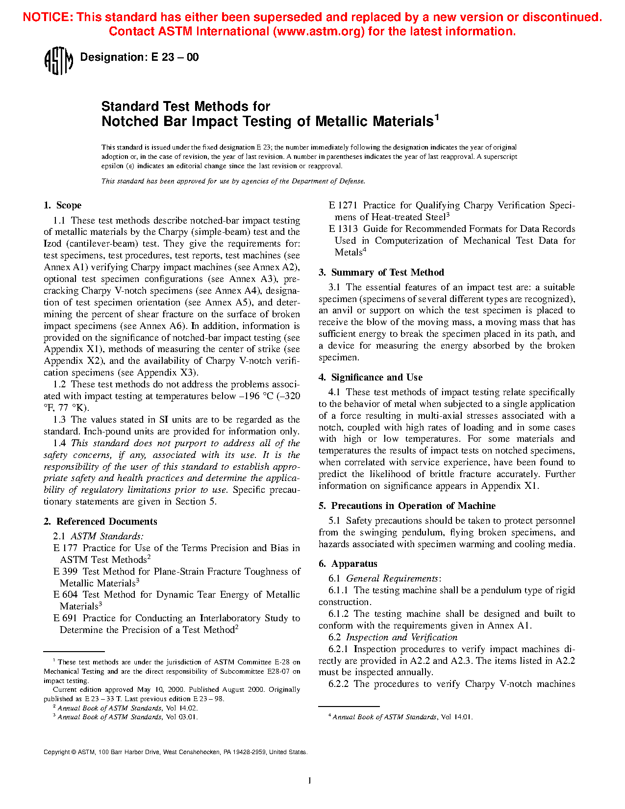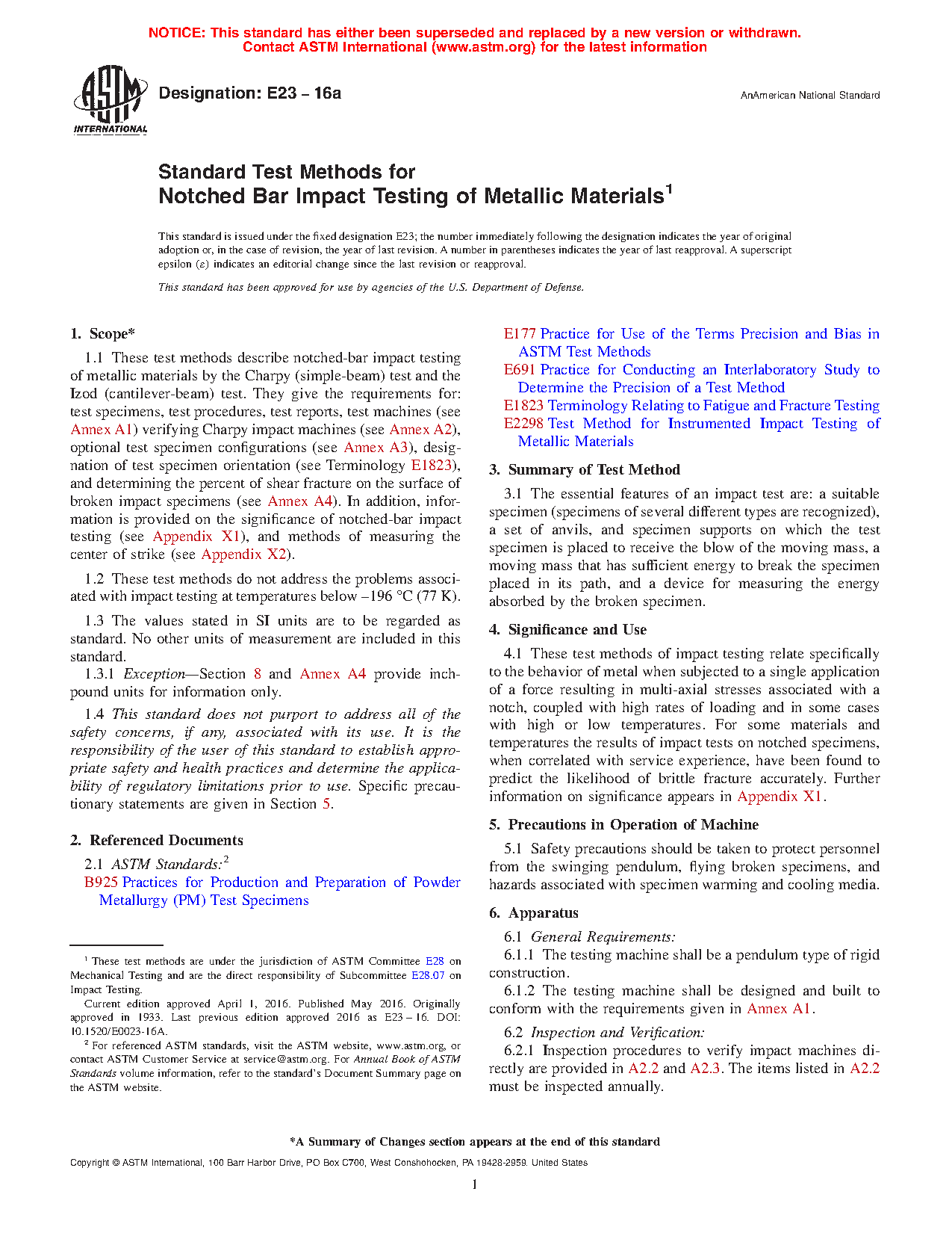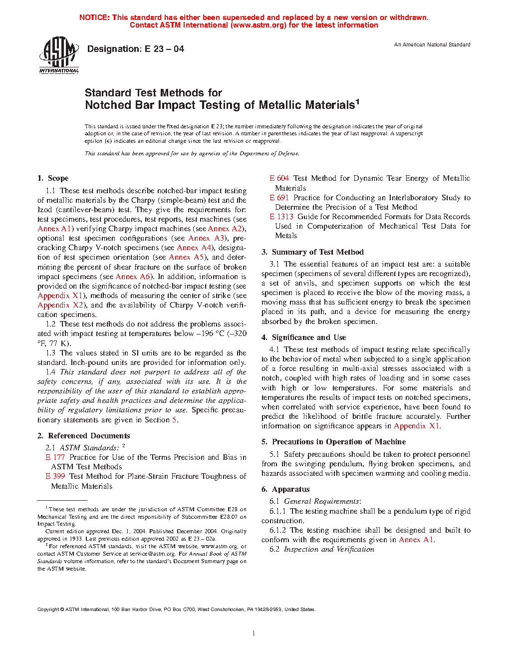 1.1 These test methods describe notched-bar impact testing of metallic materials by the Charpy (simple-beam) test and the Izod (cantilever-beam) test. They give the requirements for: test specimens, test procedures, test reports, test machines (see Annex A1) verifying Charpy impact machines (see Annex A2), optional test specimen configurations (see Annex A3), designation of test specimen orientation (see Terminology E1823), and determining the shear fracture appearance (see Annex A4). In addition, information is provided on the significance of notched-bar impact testing (see Appendix X1), and methods of measuring the center of strike (see Appendix X2).
