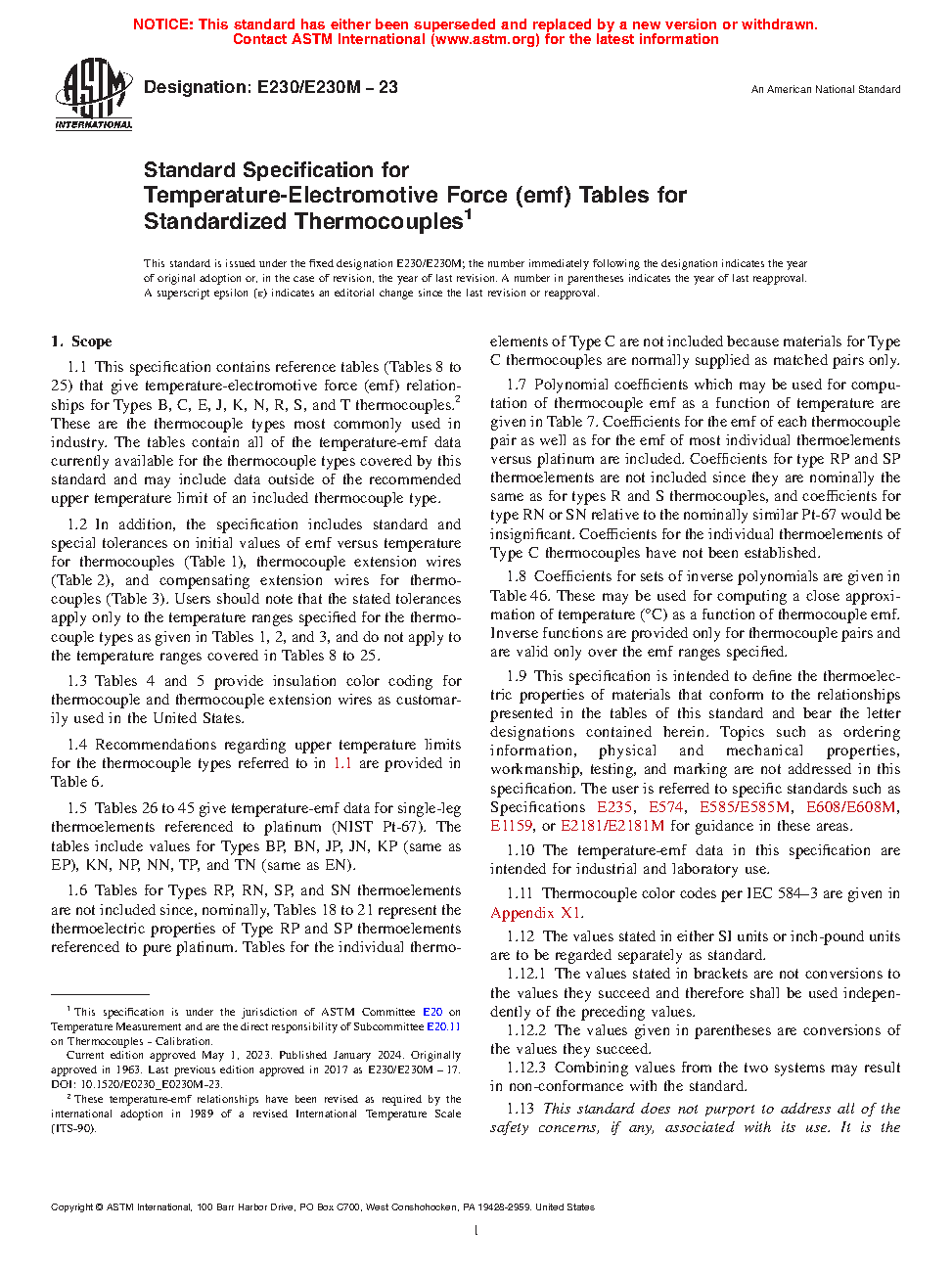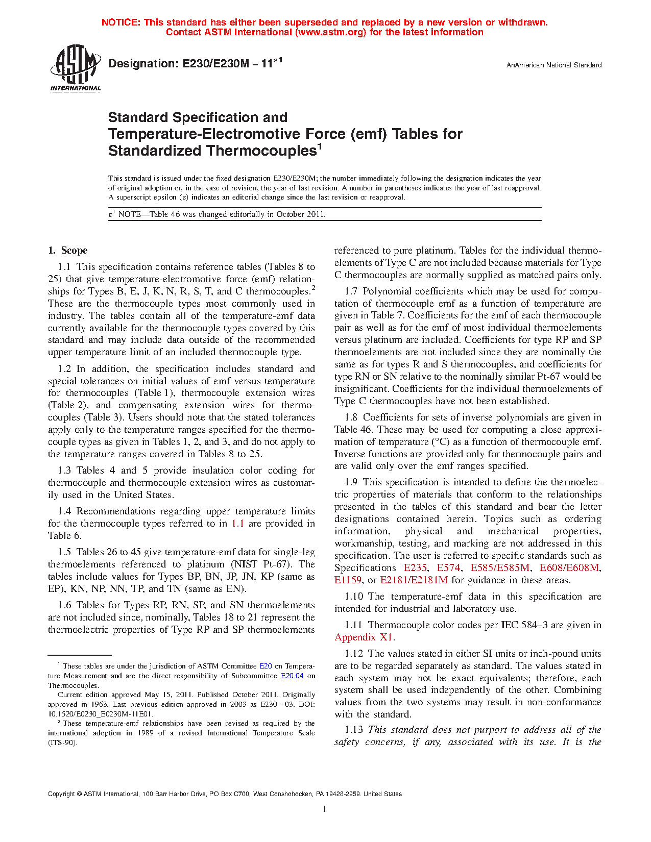 This specification contains reference tables that give temperature-electromotive force (emf) relationships for types B, E, J, K, N, R, S, T, and C thermocouples. These are the thermocouple types most commonly used in industry. Thermocouples and matched thermocouple wire pairs are normally supplied to the tolerances on initial values of emf versus temperature. Color codes for insulation on thermocouple grade materials, along with corresponding thermocouple and thermoelement letter designations are given. Four types of tables are presented: general tables, EMF versus temperature tables for thermocouples, EMF versus temperature tables for thermoelements, and supplementary tables.
