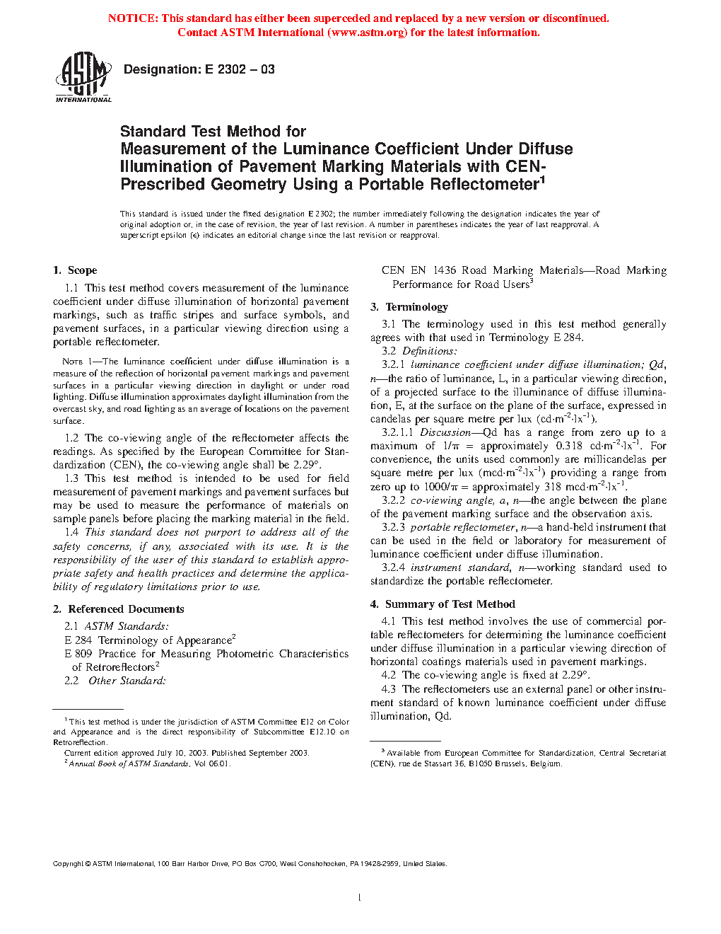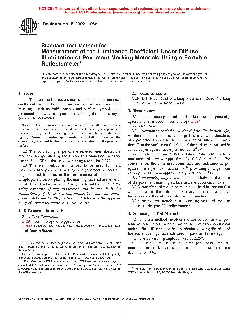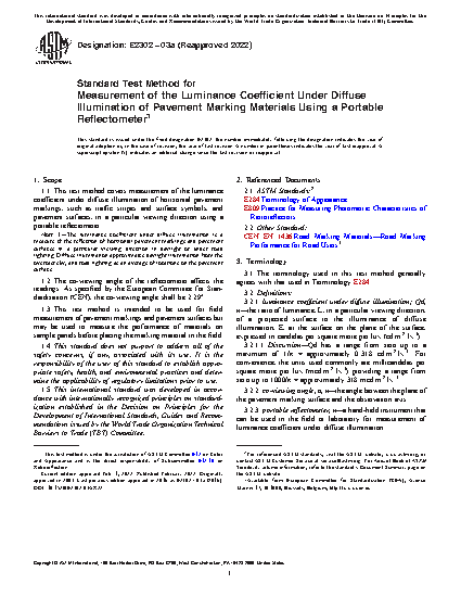 1.1 This test method covers measurement of the luminance coefficient under diffuse illumination of horizontal pavement markings, such as traffic stripes and surface symbols, and pavement surfaces, in a particular viewing direction using a portable reflectometer.