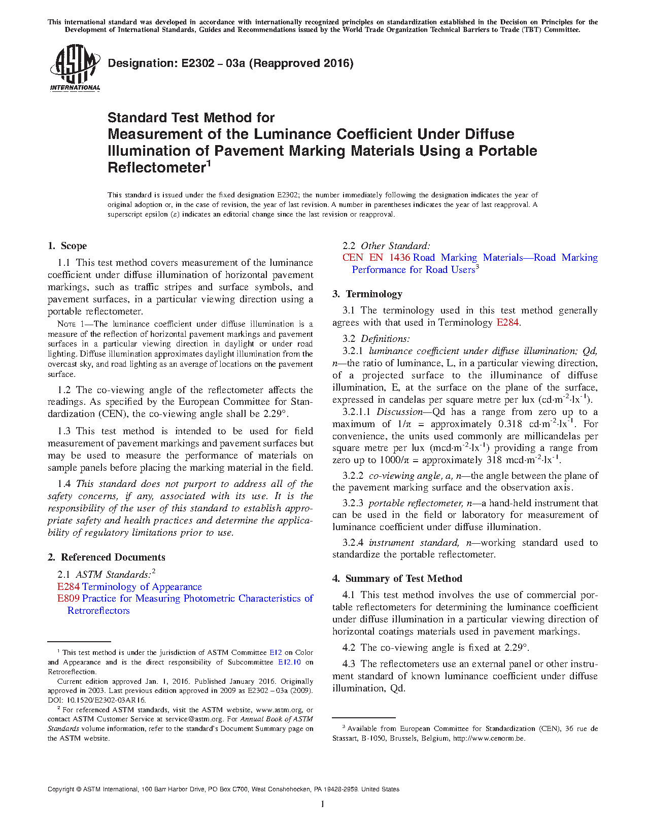 Note 1—The luminance coefficient under diffuse illumination is a measure of the reflection of horizontal pavement markings and pavement surfaces in a particular viewing direction in daylight or under road lighting. Diffuse illumination approximates daylight illumination from the overcast sky, and road lighting as an average of locations on the pavement surface.