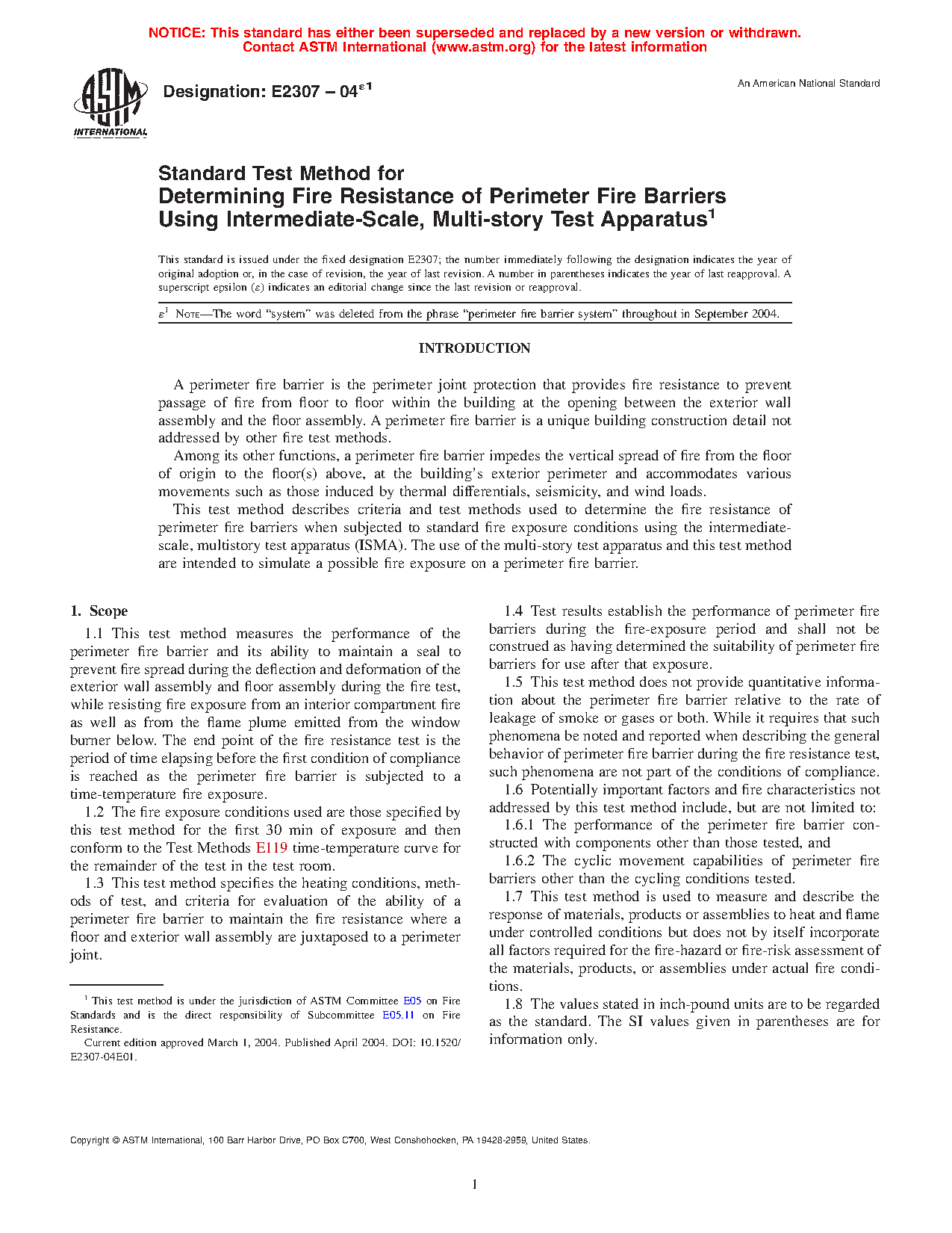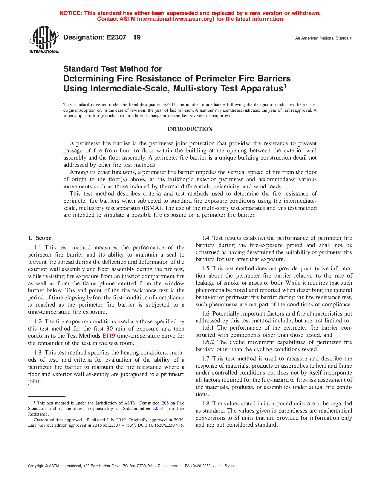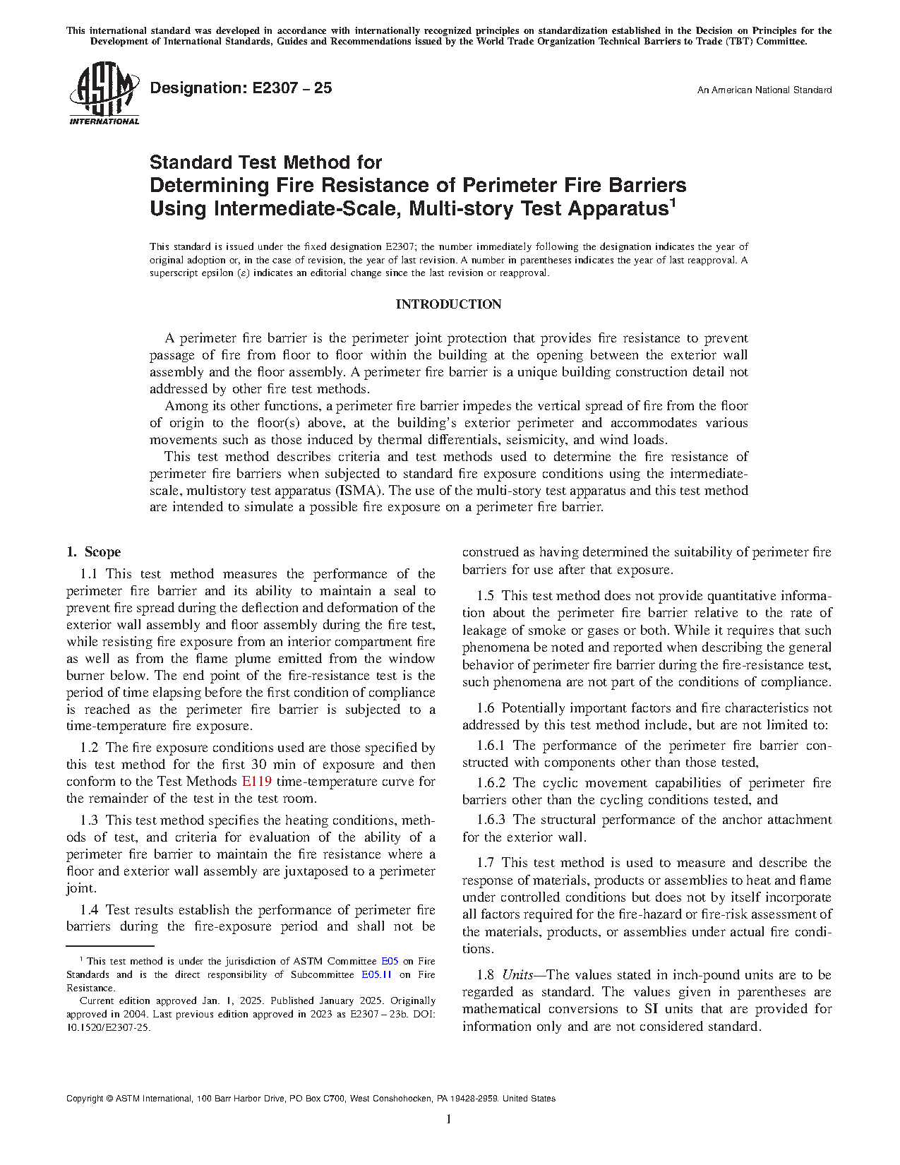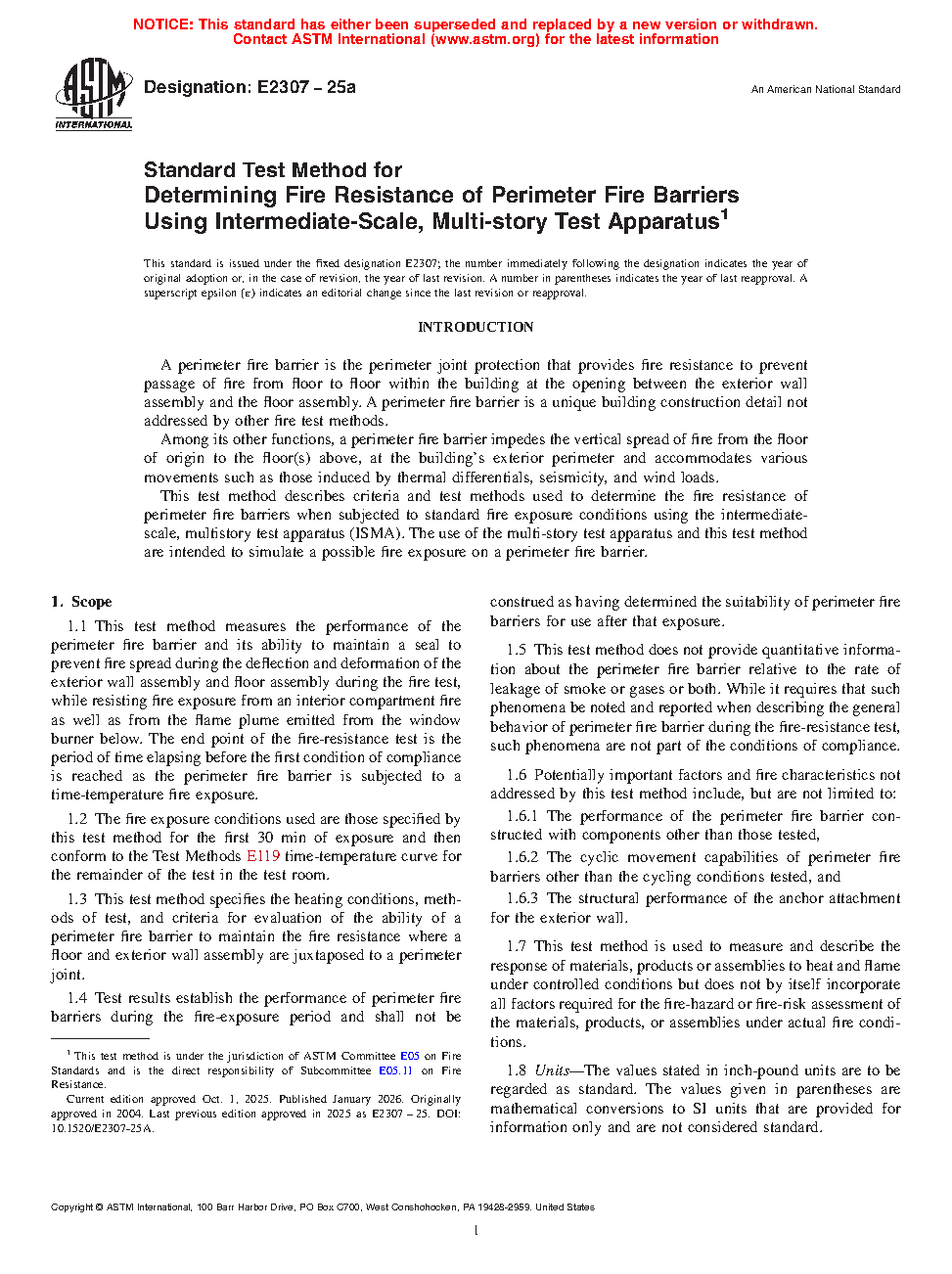1.3 This test method specifies the heating conditions, methods of test, and criteria for evaluation of the ability of a perimeter fire barrier to maintain the fire resistance where a floor and exterior wall assembly are juxtaposed to a perimeter joint.