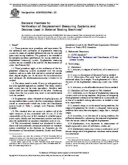 1.1 These practices cover procedures and requirements for the calibration and verification of displacement measuring systems by means of standard calibration devices for static and quasi-static testing machines. This practice is not intended to be complete purchase specifications for testing machines or displacement measuring systems. Displacement measuring systems are not intended to be used for the determination of strain. See Practice E83.