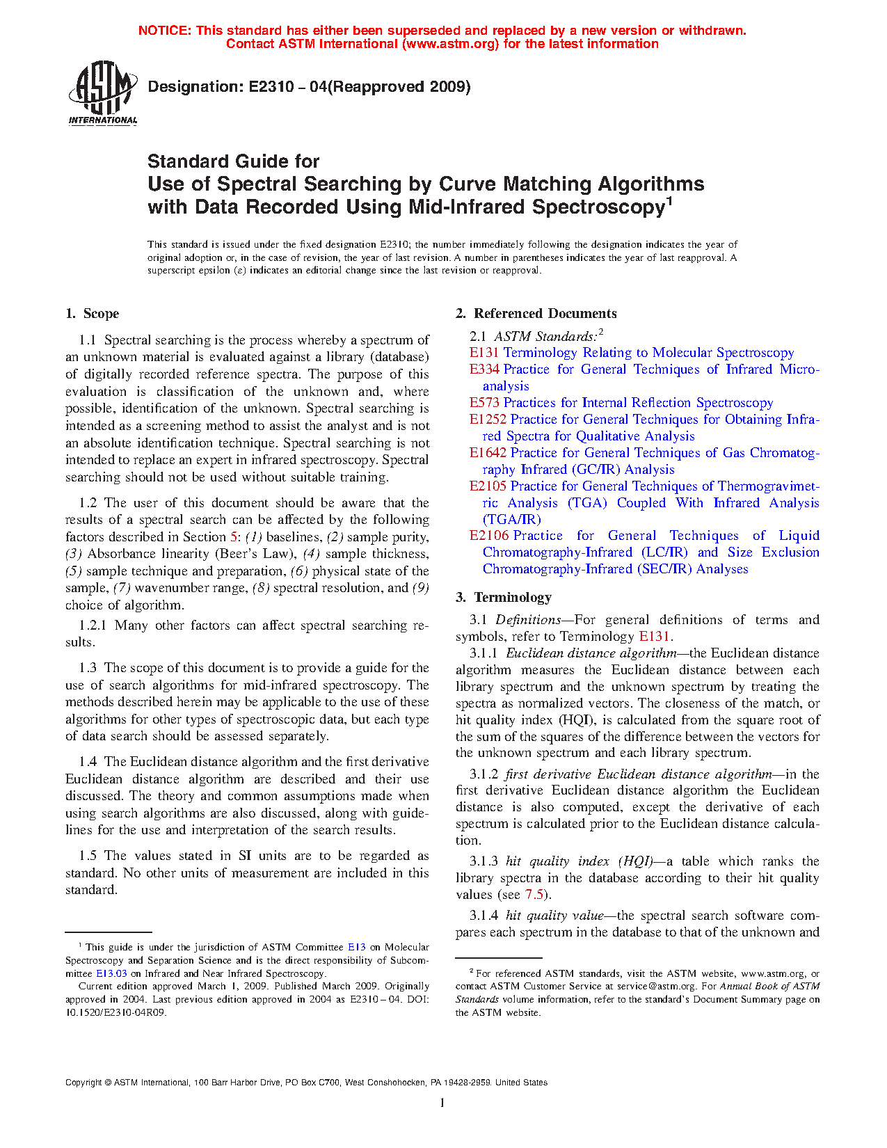 This guide presents the use of spectral searching by curve matching search algorithms for data recorded using mid-infrared spectroscopy. The methods described herein may be applicable to the use of these algorithms for other types of spectroscopic data, but each type of data search should be assessed separately. The purpose of this evaluation is the classification and, where possible, identification of the unknown. Spectral searching is intended as a screening method to assist the analyst, and is not an absolute identification technique, and hence, not intended to replace an expert in infrared spectroscopy and should not be used without suitable training. The Euclidean distance algorithm and the first derivative Euclidean distance algorithm are described and their use discussed. The theory and common assumptions made when using search algorithms are also discussed, along with guidelines for the use and interpretation of the search results.