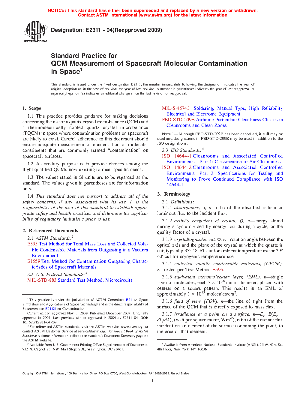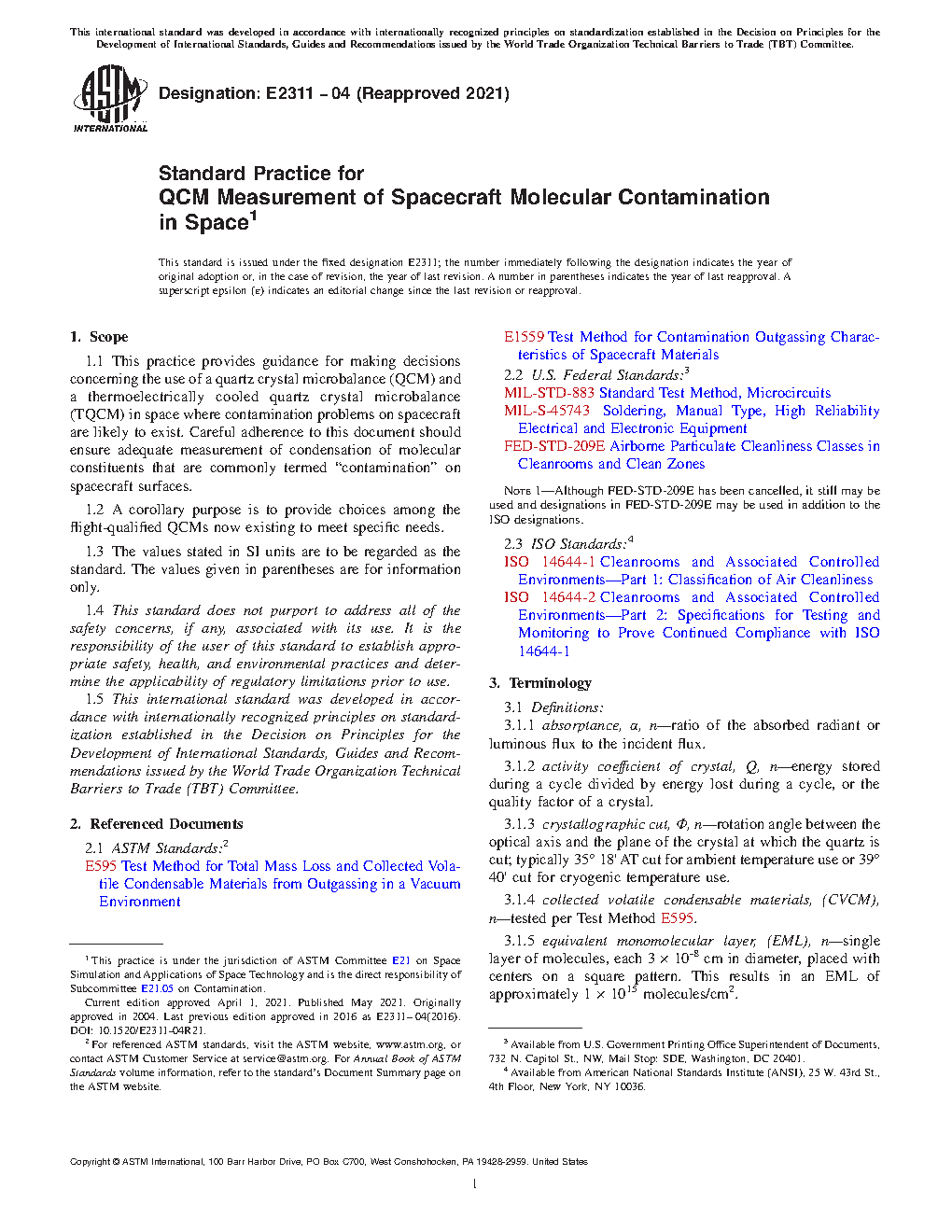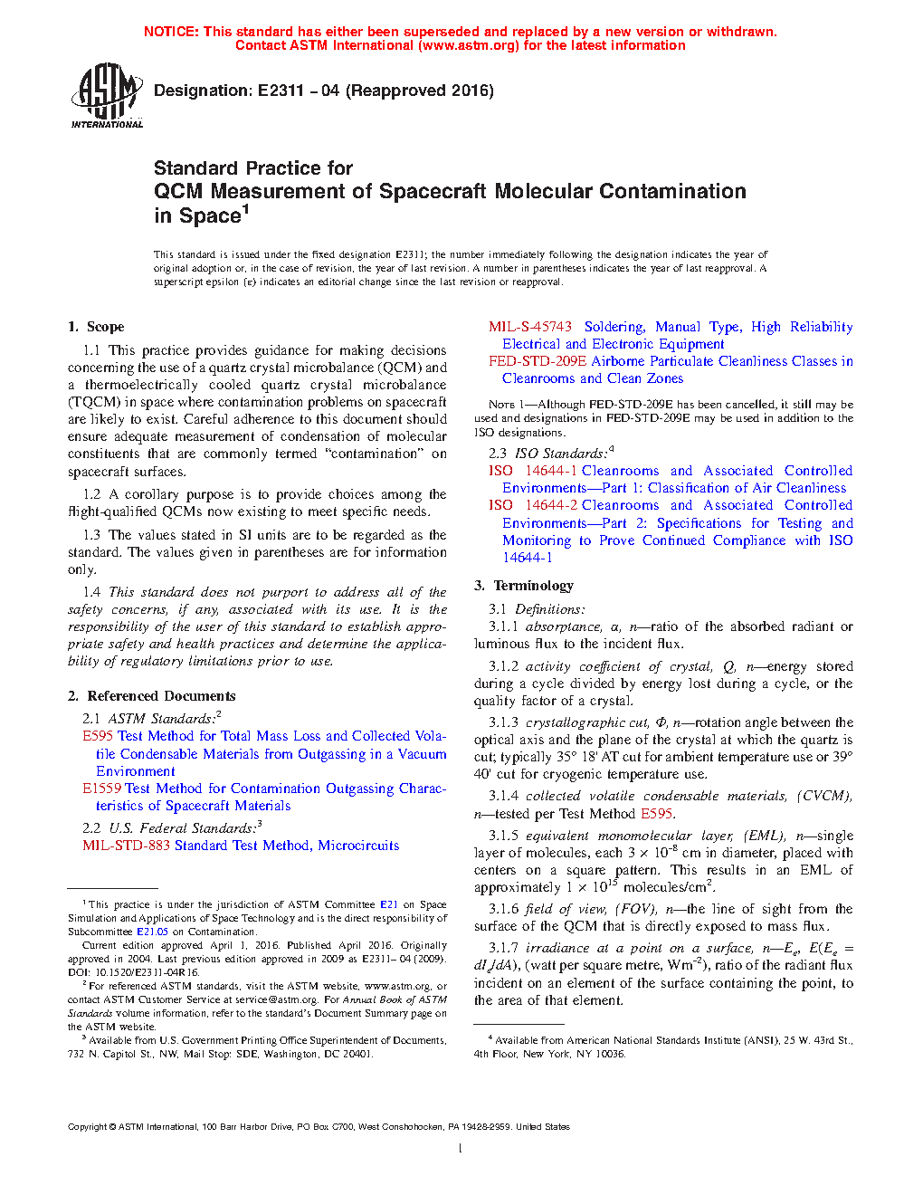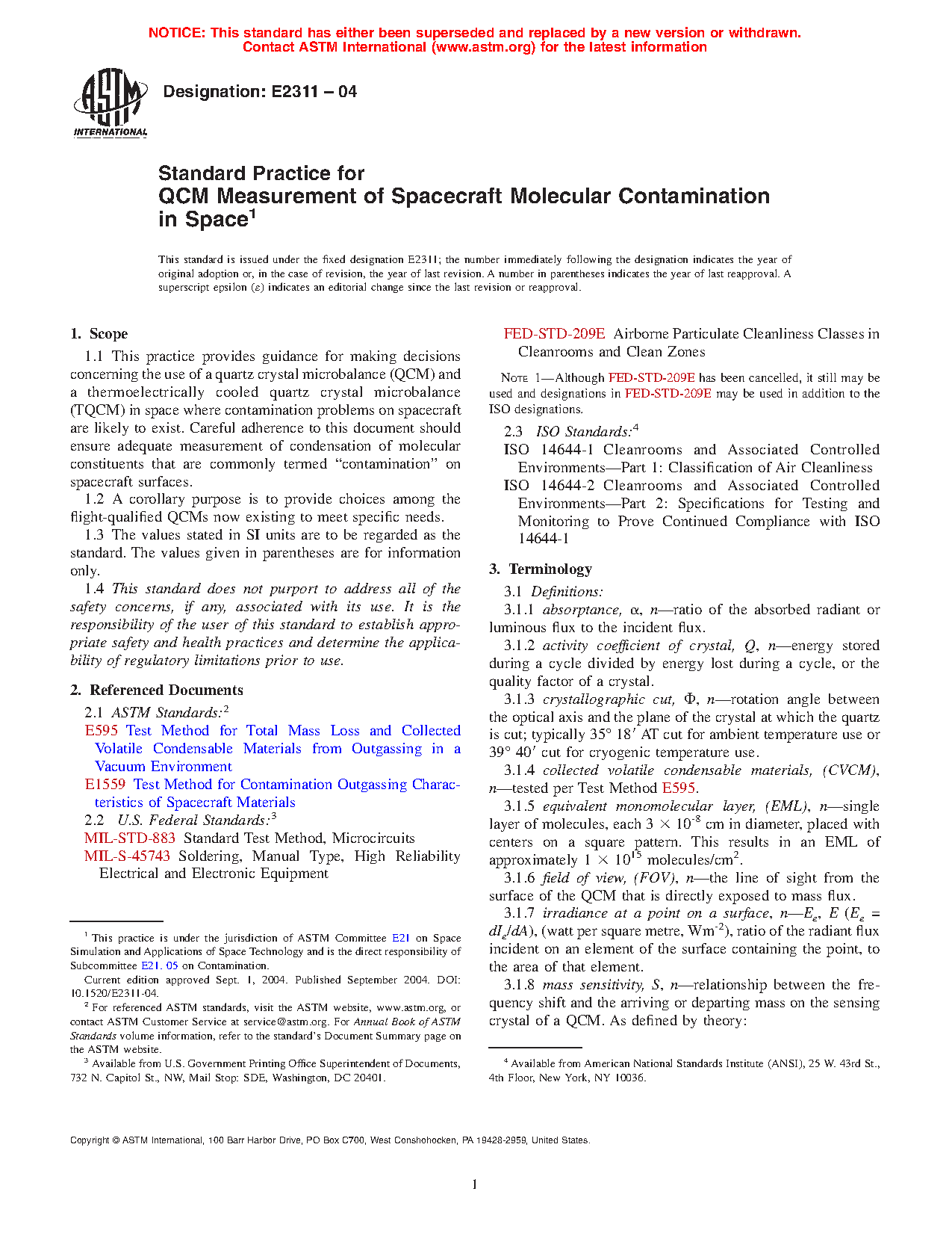 Spacecraft have consistently had the problem of contamination of thermal control surfaces from line-of-sight warm surfaces on the vehicle, outgassing of materials and subsequent condensation on critical surfaces, such as solar arrays, moving mechanical assemblies, cryogenic insulation schemes, and electrical contacts, control jet effects, and other forms of expelling molecules in a vapor stream. To this has been added the need to protect optical components, either at ambient or cryogenic temperatures, from the minutest deposition of contaminants because of their absorptance, reflectance or scattering characteristics. Much progress has been accomplished in this area, such as the careful testing of each material for outgassing characteristics before the material is used on the spacecraft (following Test Methods E595 and E1559), but measurement and control of critical surfaces during spaceflight still can aid in the determination of location and behavior of outgassing materials.