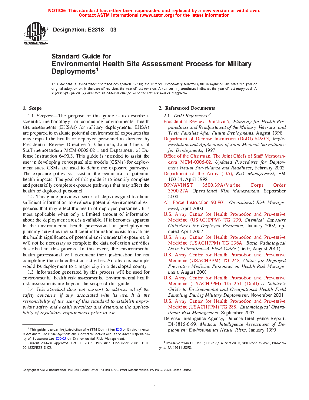 1.1 Purpose—The purpose of this guide is to describe a scientific methodology for conducting environmental health site assessments (EHSAs) for military deployments. EHSAs are prepared to evaluate potential environmental exposures that may impact the health of deployed personnel as directed by Presidential Review Directive 5; Chairman, Joint Chiefs of Staff memorandum MCM-0006-02; and Department of Defense Instruction 6490.3. This guide is intended to assist the user in developing conceptual site models (CSMs) for deployment sites. CSMs are used to define the exposure pathways. The exposure pathways assist in the evaluation of potential health impacts. The goal of this guide is to identify complete and potentially complete exposure pathways that may affect the health of deployed personnel.