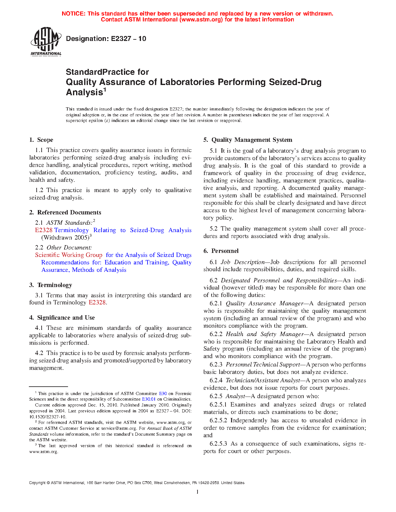 1.1 This practice covers quality assurance issues in forensic laboratories performing seized-drug analysis including evidence handling, analytical procedures, report writing, method validation, documentation, proficiency testing, audits, and health and safety.