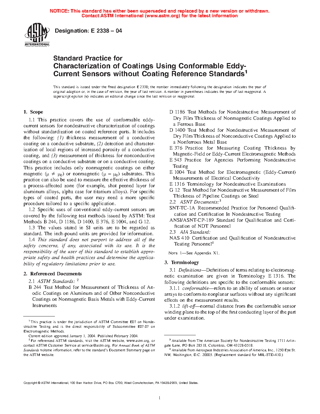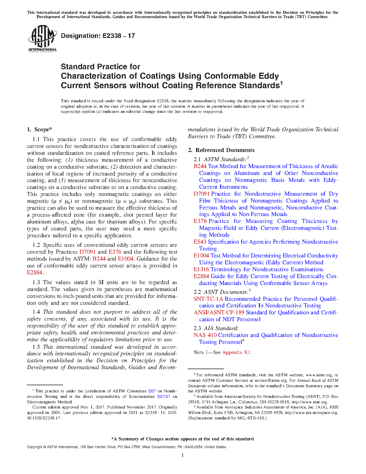 1.1 This practice covers the use of conformable eddy-current sensors for nondestructive characterization of coatings without standardization on coated reference parts. It includes the following: (1) thickness measurement of a conductive coating on a conductive substrate, (2) detection and characterization of local regions of increased porosity of a conductive coating, and (3) measurement of thickness for nonconductive coatings on a conductive substrate or on a conductive coating. This practice includes only nonmagnetic coatings on either magnetic μ = μ 0) or nonmagnetic (μ = μ0) substrates. This practice can also be used to measure the effective thickness of a process-affected zone (for example, shot peened layer for aluminum alloys, alpha case for titanium alloys). For specific types of coated parts, the user may need a more specific procedure tailored to a specific application.