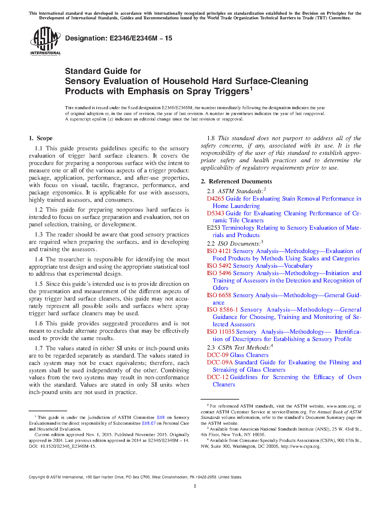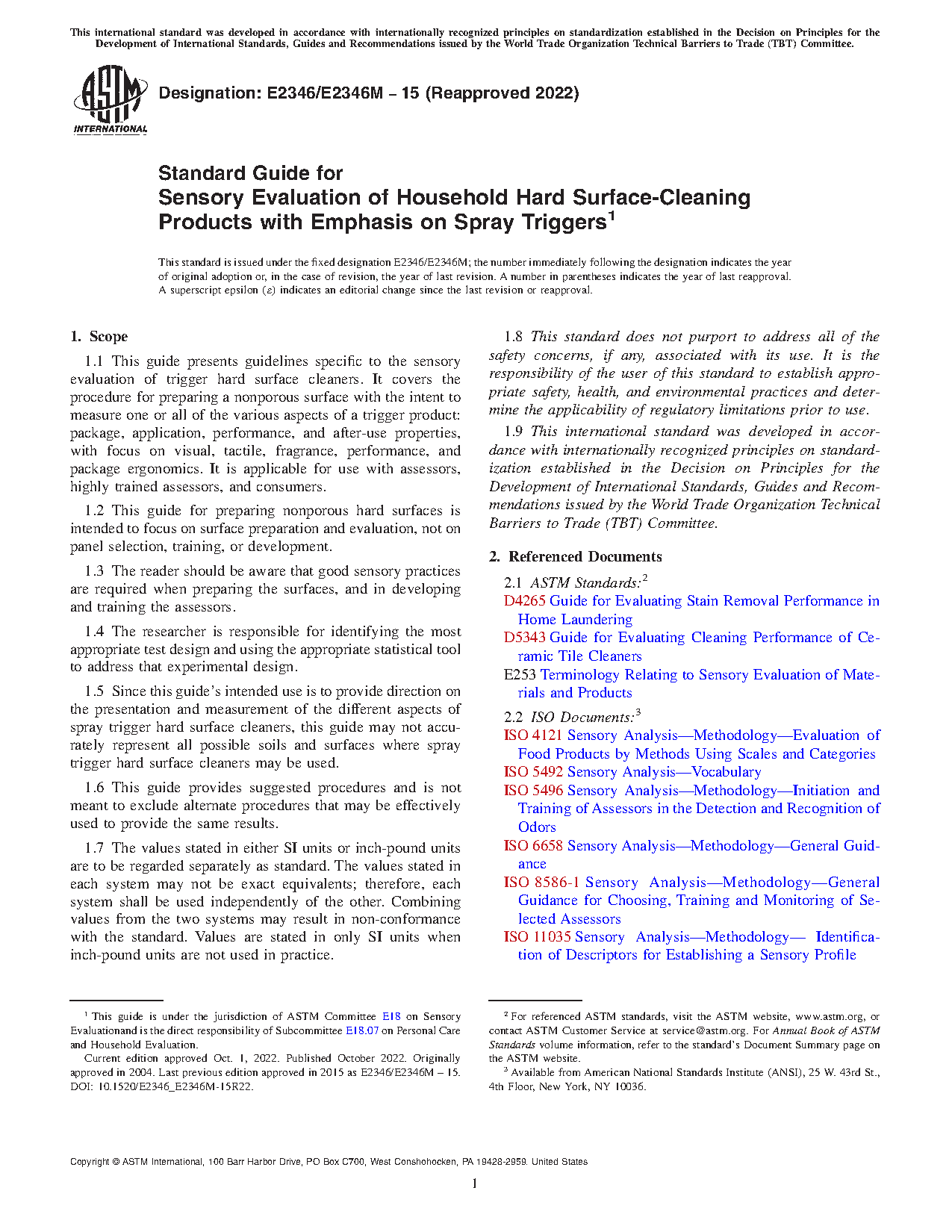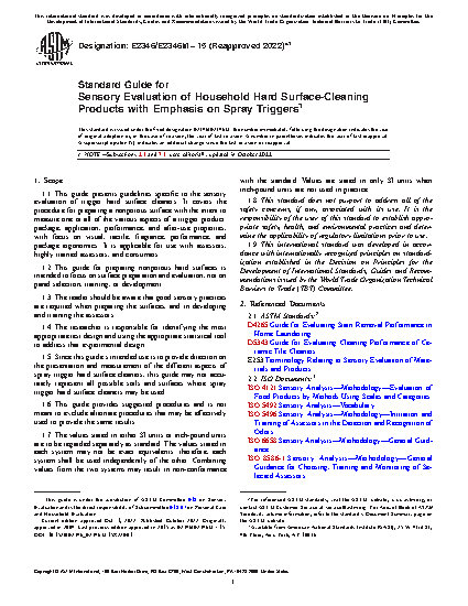 1.1 This guide presents guidelines specific to the sensory evaluation of trigger hard surface cleaners. It covers the procedure for preparing a nonporous surface with the intent to measure one or all of the various aspects of a trigger product: package, application, performance, and after-use properties, with focus on visual, tactile, fragrance, performance, and package ergonomics. It is applicable for use with assessors, highly trained assessors, and consumers.