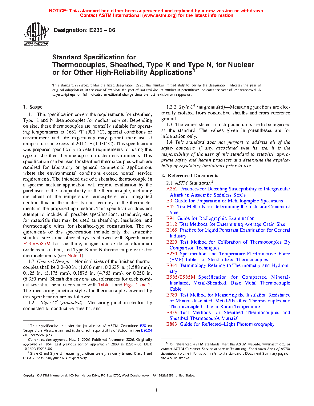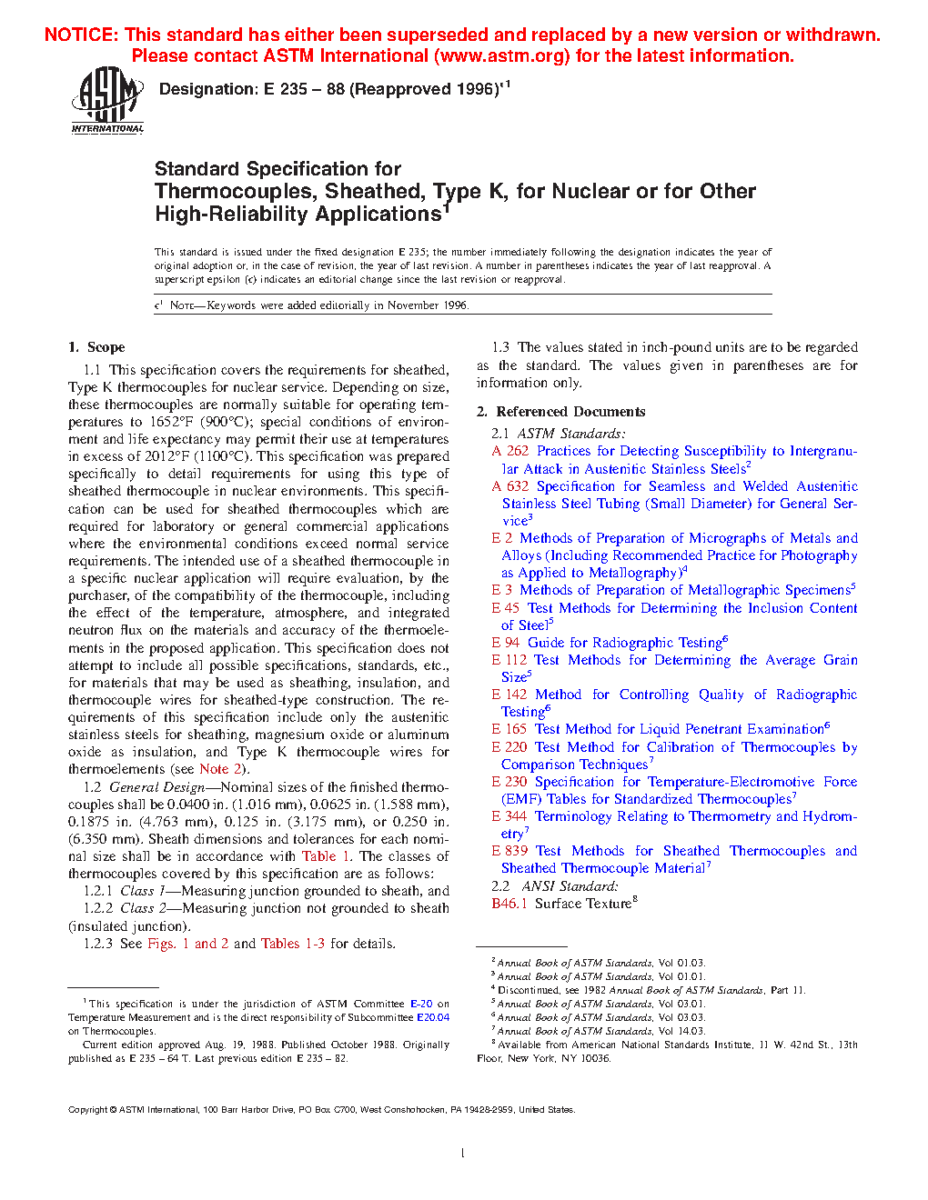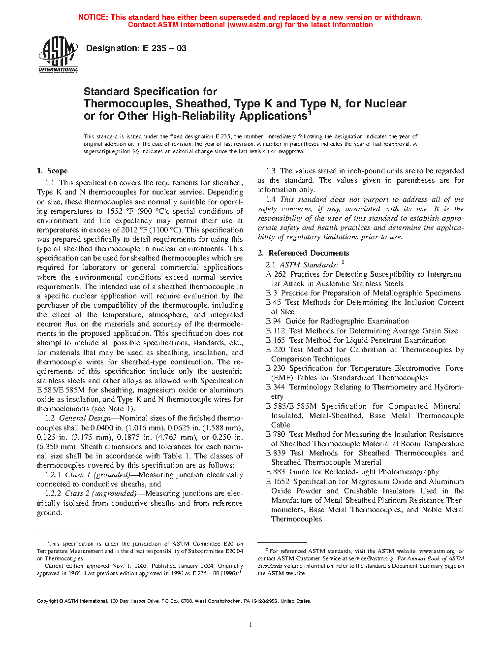 1.1 Intent- This specification presents the requirements for sheathed, Type K thermocouples for nuclear service. Depending on size, these thermocouples are normally suitable for operating temperatures to 1652°F (900°C); special conditions of environment and life expectancy may permit their use at temperatures in excess of 2012°F (1100°C). This specification was prepared specifically to detail requirements for using this type of sheathed thermocouple in nuclear environments. This specification can be used for sheathed thermocouples which are required for laboratory or general commercial applications where the environmental conditions exceed normal service requirements. The intended use of a sheathed thermocouple in a specific nuclear application will require evaluation, by the purchaser, of the compatibility of the thermocouple, including the effect of the temperature, atmosphere, and integrated neutron flux on the materials and accuracy of the thermoelements in the proposed application. This specification does not attempt to include all possible specifications, standards, etc., for materials that may be used as sheathing, insulation, and thermocouple wires for sheathed-type construction. The requirements of this specification include only the austenitic stainless steels for sheathing, magnesium oxide or aluminum oxide as insulation, and Type K thermocouple wires for thermoelements (see Note 2).