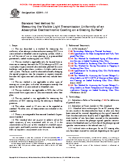 1.2 The test method is applicable only for layered (one or more active coatings between the TCOs) absorptive ECCs on vision glass (superstrate and substrate) areas planned for use in buildings, such as glass doors, windows, skylights, and exterior wall systems. The layers used for electrochromically changing the optical properties may be inorganic or organic materials between the superstrate and substrate and may include laminates.