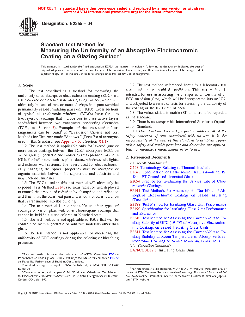 1.1 The test described is a method for measuring the uniformity of an absorptive electrochromic coating (ECC) in a static colored or bleached state on a glazing surface, which is or will be one of two or more glazings in a preassembled permanently sealed insulating glass unit (IGU).