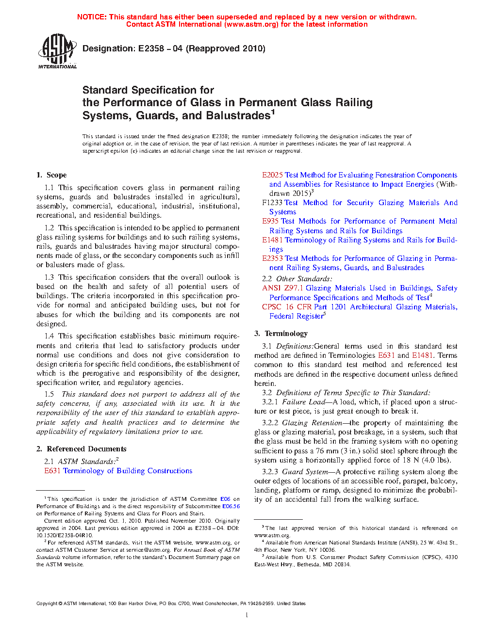 1.1 This specification covers glass in permanent railing systems, guards and balustrades installed in agricultural, assembly, commercial, educational, industrial, institutional, recreational, and residential buildings.