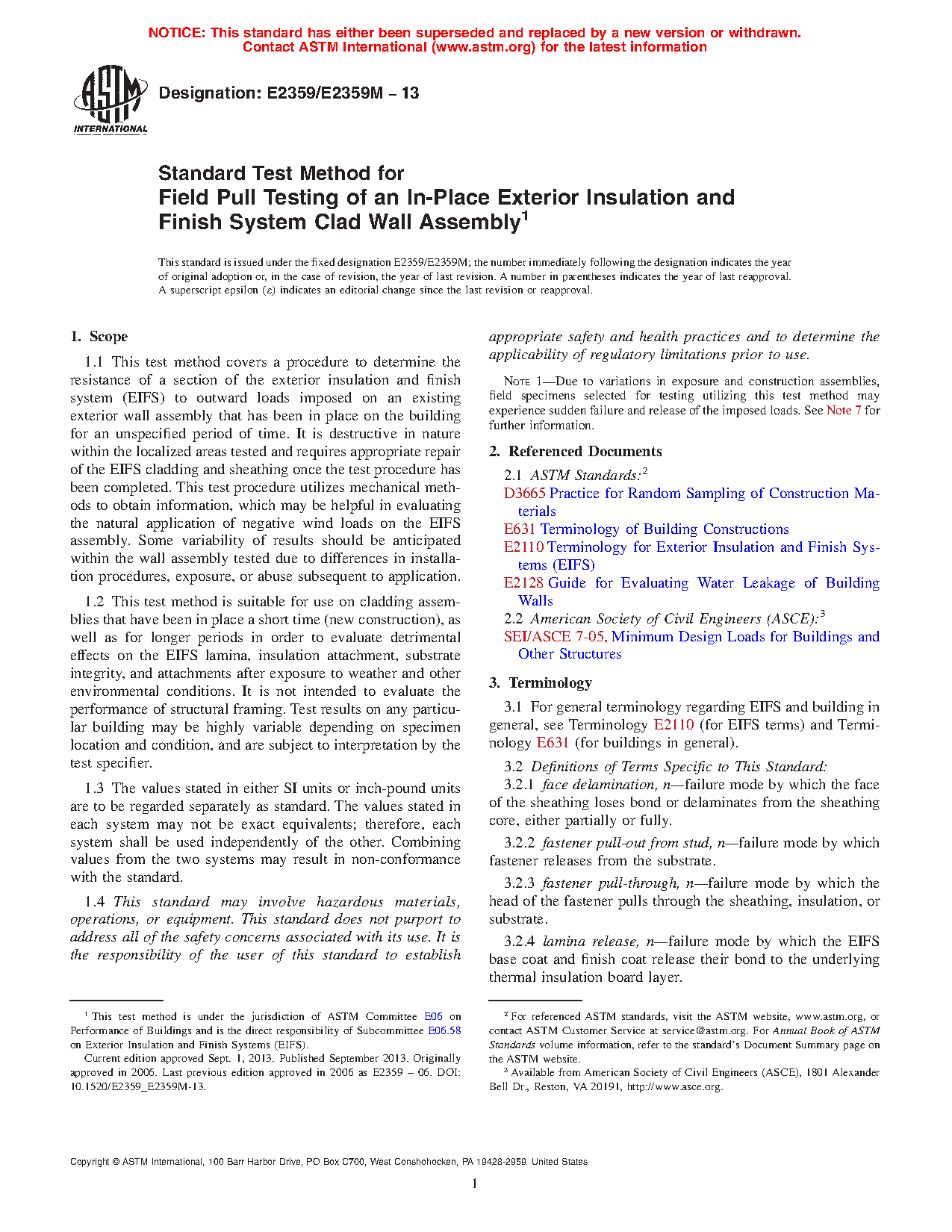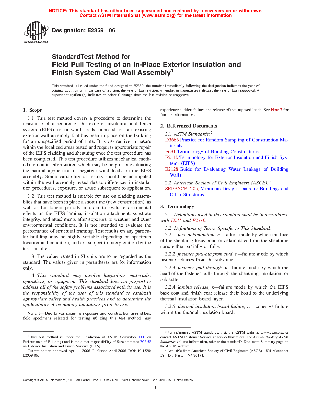 4.3 This method is intended for use on test specimens occurring or installed on existing buildings. The loss of outward wind load resistance of an EIFS wall assembly after exposure to moisture and other weather conditions may compromise the ability of the cladding or other wall components to perform adequately in place. This test method does not provide any means by which the test results may be generalized to the larger wall area. Such efforts should be based on experience and engineering judgement.