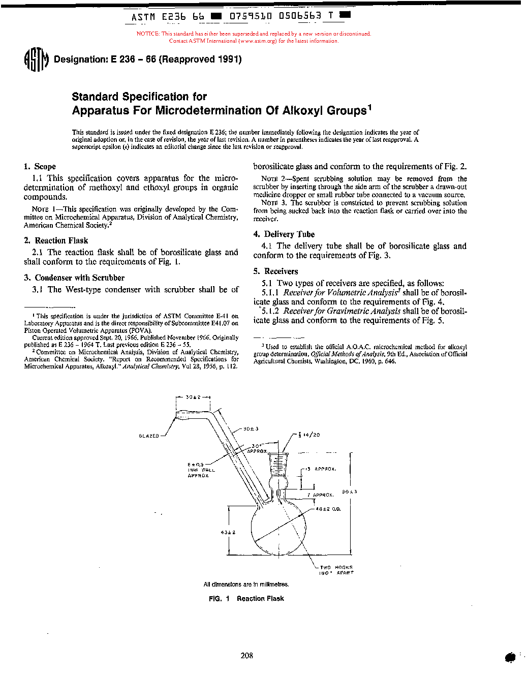 This specification covers the design and dimensional requirements for the apparatus used in the microdetermination of methoxyl and ethoxyl groups in organic compounds. This apparatus is composed of a reaction flask, condenser with scrubber, delivery tube, and two types of receivers—one for volumetric analysis, and the other for gravimetric analysis.