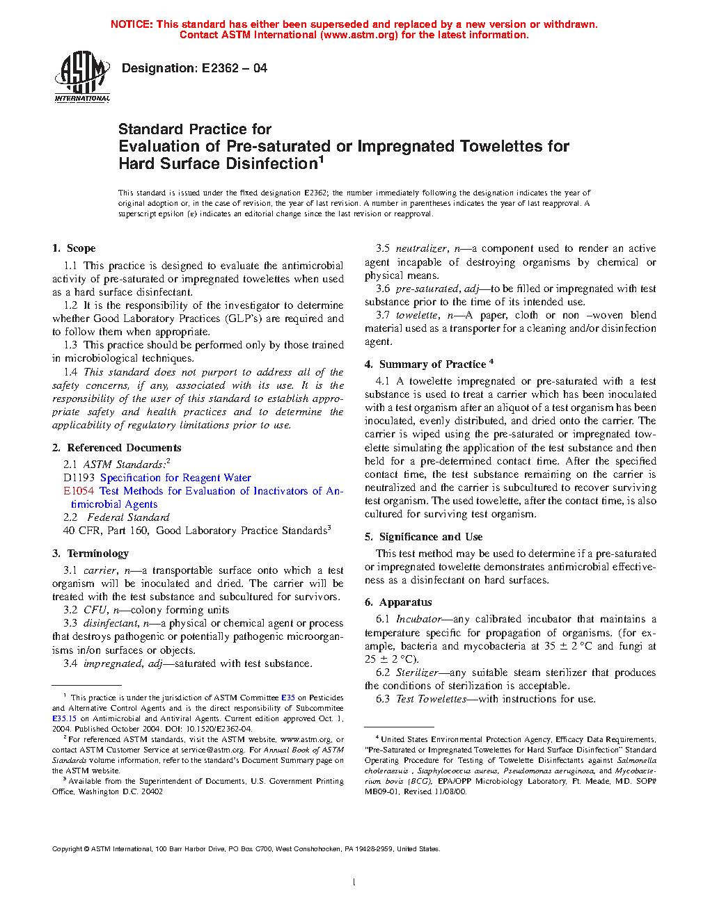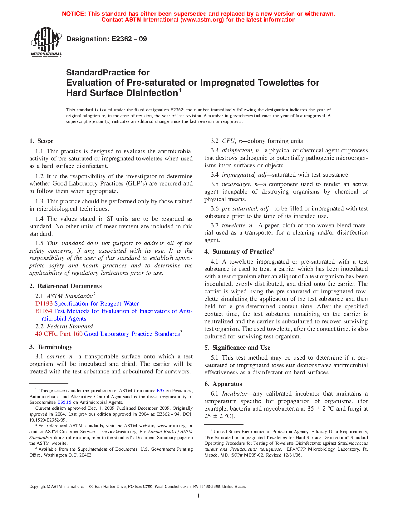 1.1 This practice is designed to evaluate the antimicrobial activity of pre-saturated or impregnated towelettes when used as a hard surface disinfectant.