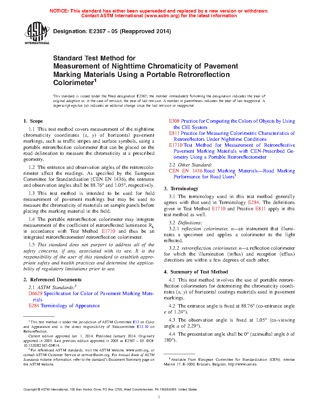 1.2 The entrance and observation angles of the retrorecolorimeter affect the readings. As specified by the European Committee for Standardization (CEN EN 1436), the entrance and observation angles shall be 88.76° and 1.05°, respectively.