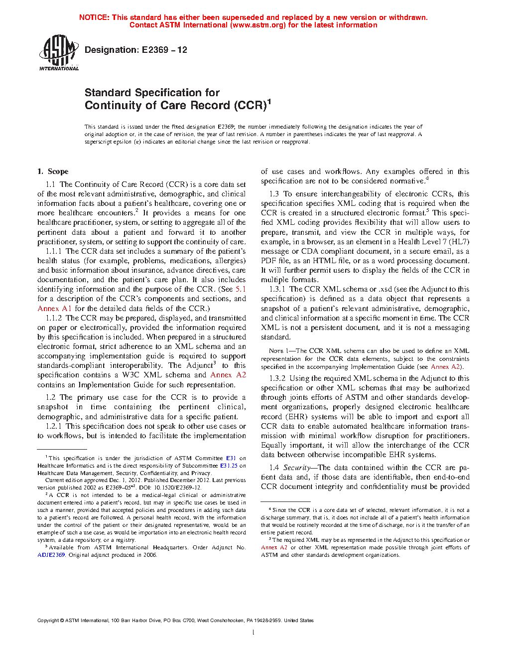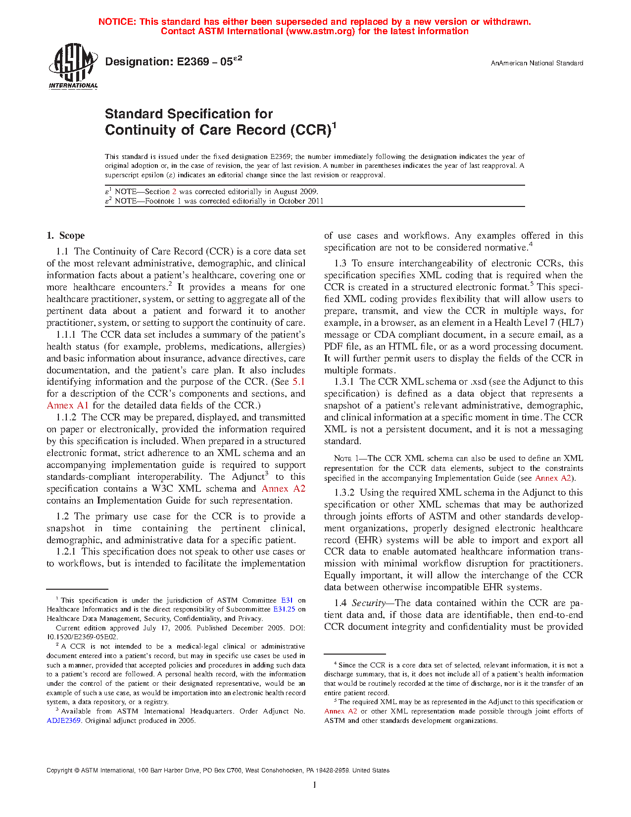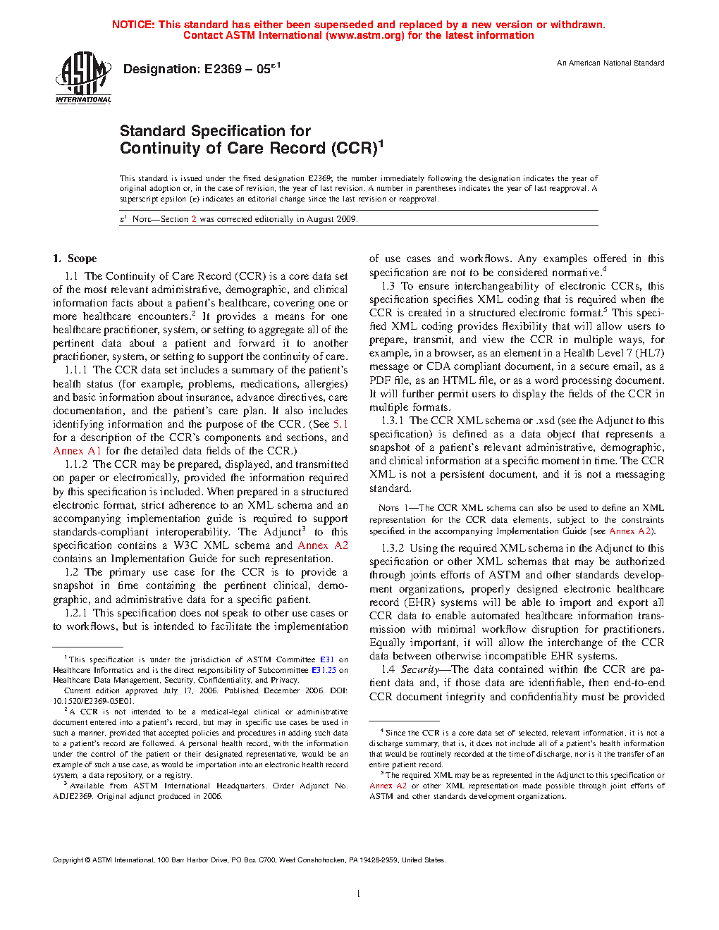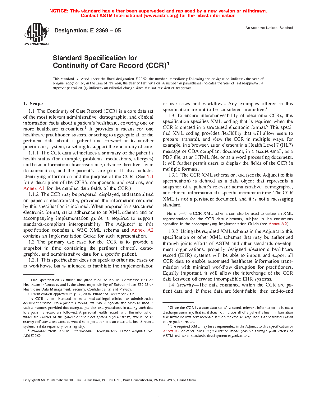 1.4.2 Additional Subcommittee E31.20 on Security and Privacy guides, practices, and specifications will be published in support of the security and privacy needs of specific CCR use cases. When a specification is necessary to assure interoperability or other required functionality, the CCR core schema will be extended to meet the profile requirements of the underlying use case, building upon existing standards and specifications whenever possible.