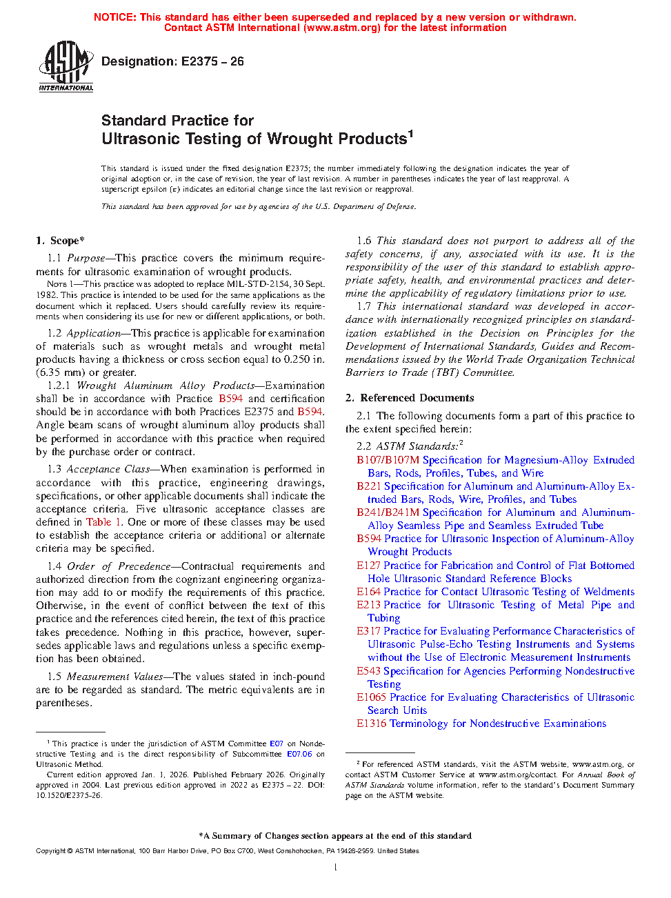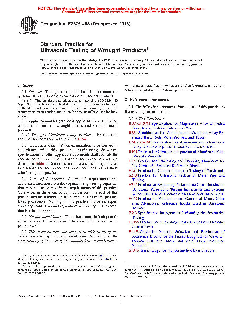1.1 PurposeThis practice establishes the minimum requirements for ultrasonic examination of wrought products.