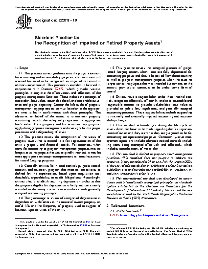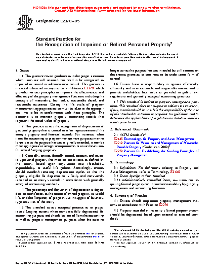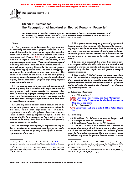 1.2 This practice covers the recognition of depreciation of personal property that is critical to a fair representation of the entity’s property and financial records. For instances when items for accounting or property management purposes may no longer serve the purpose that was originally intended, it may be more appropriate to recognize impairments or retire these items for record keeping purposes.